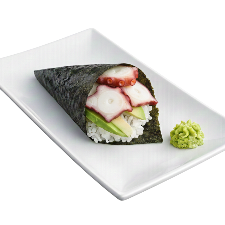 Cono de alga nori con arroz de sushi (70 grs), pepino, aguacate y 30 grs de pulpo.