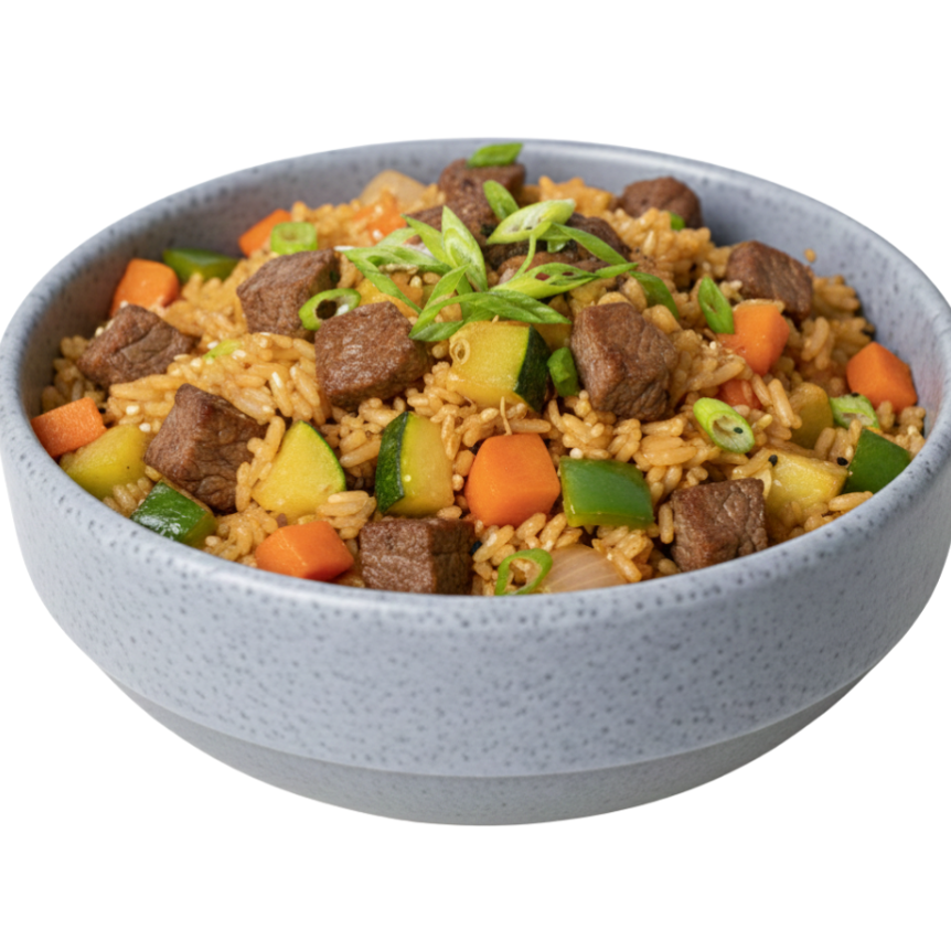 Arroz frito a la plancha con verduras (zanahoria, cebolla, calabaza, pimiento verde), huevo y 60 grs de filete de res.