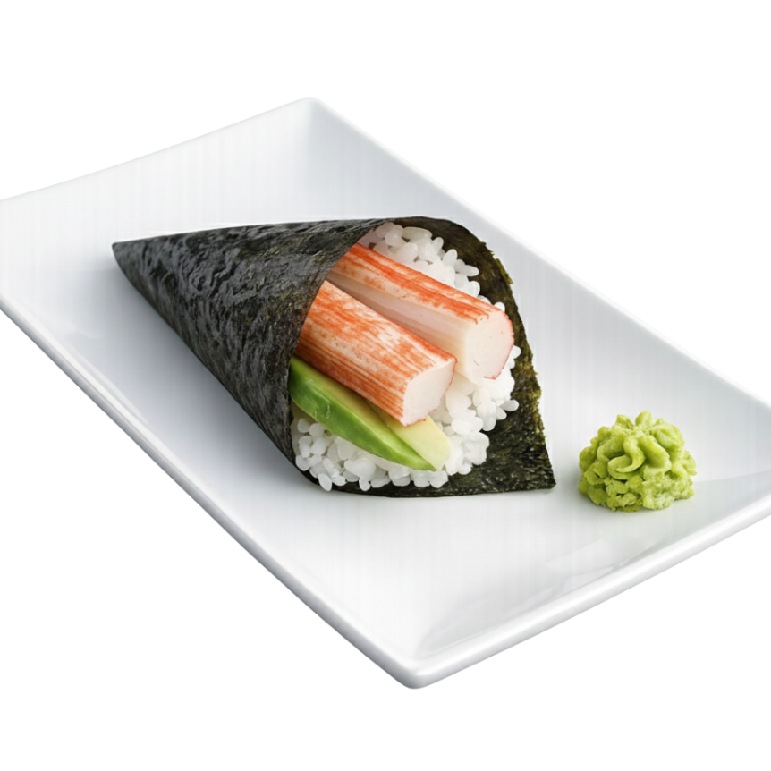 Cono de alga nori con arroz de sushi (70 grs), pepino, aguacate y 30 grs de cangrejo.