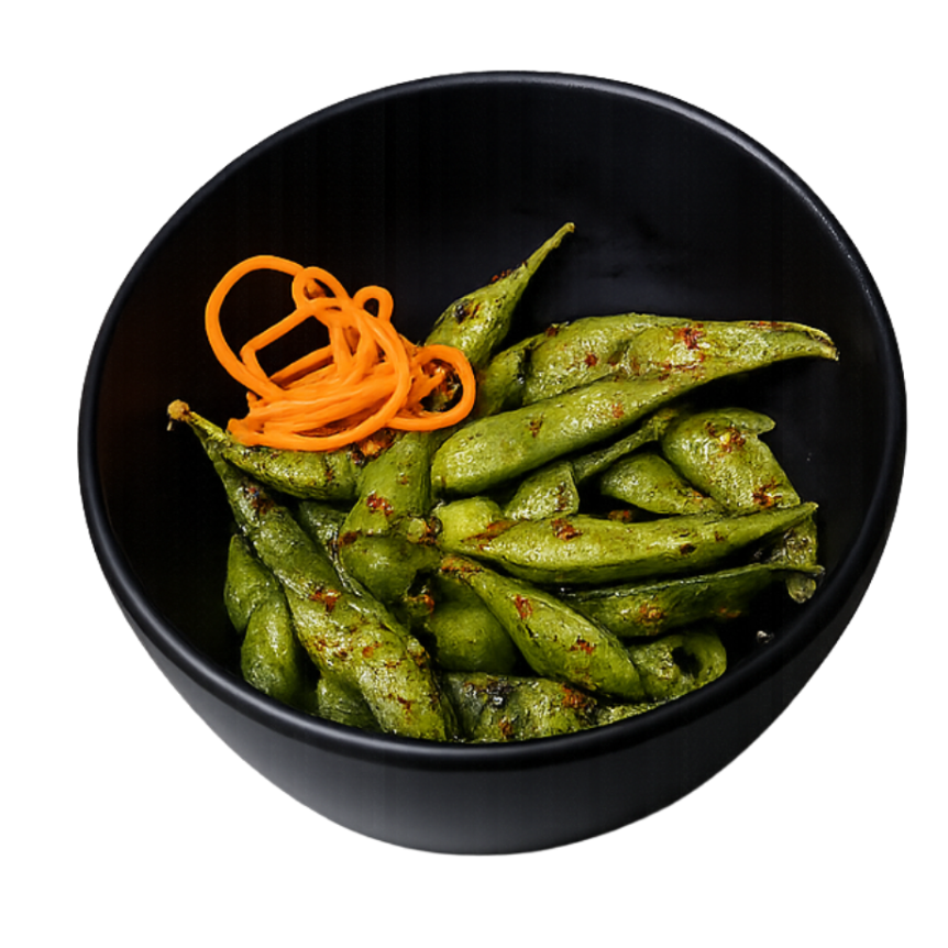 Frijol de soya tierno en vaina (120grs) asados a la plancha con un toque de sal pimienta y soya.
