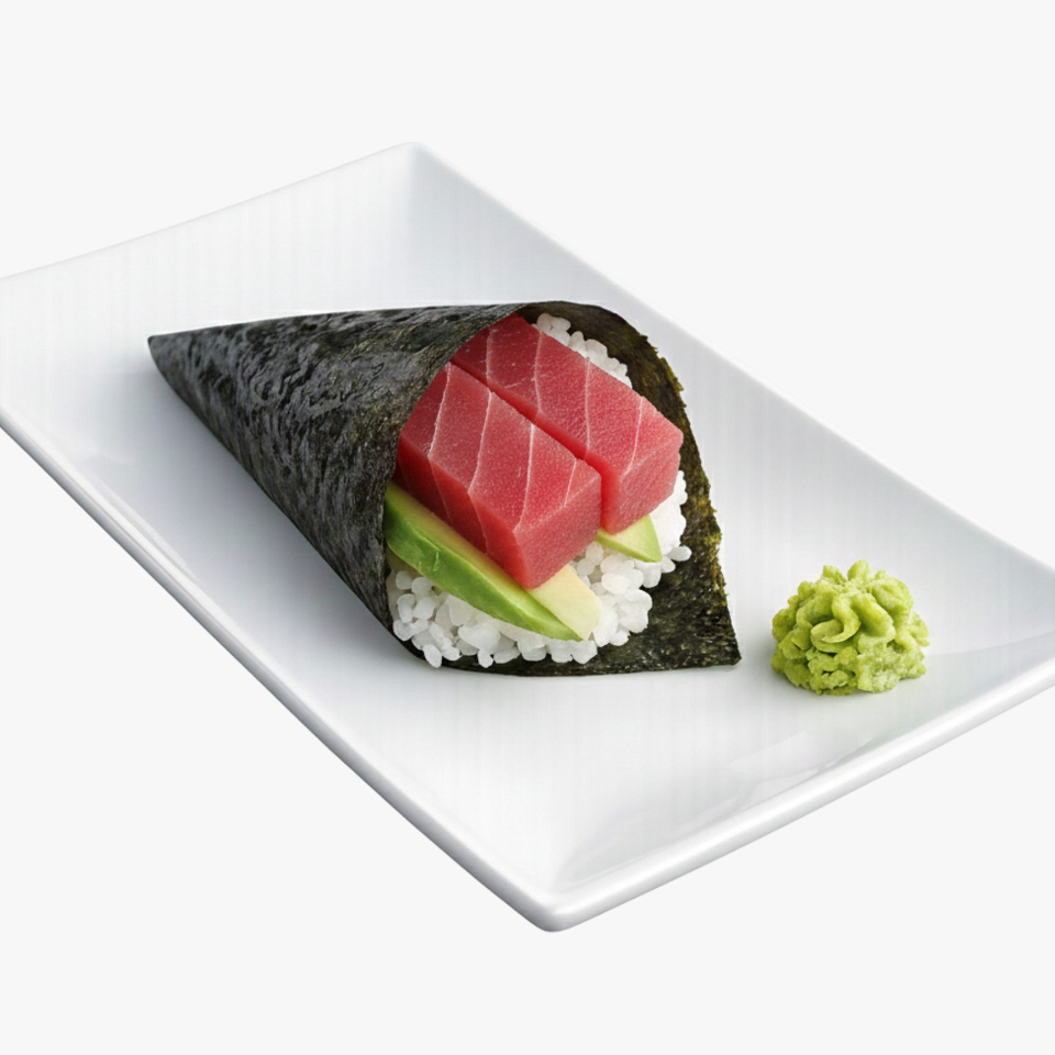 Cono de alga nori con arroz de sushi (70 grs), pepino, aguacate y 30 grs de atun.
