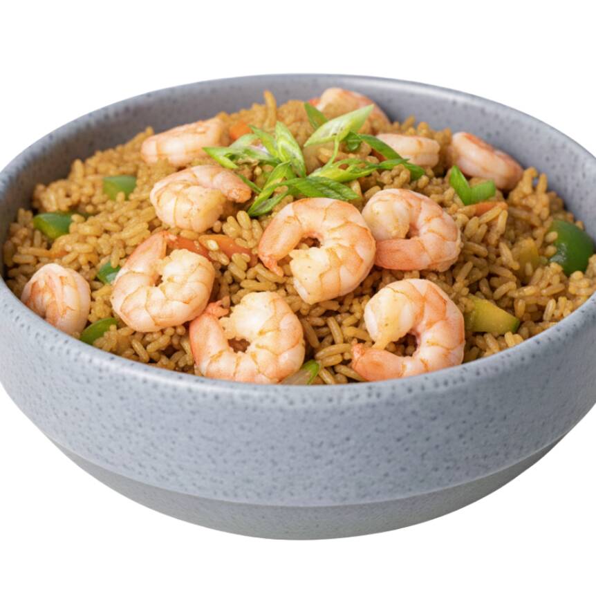 Arroz frito a la plancha con verduras (zanahoria, cebolla, calabaza, pimiento verde), huevo y 60 grs de camaron