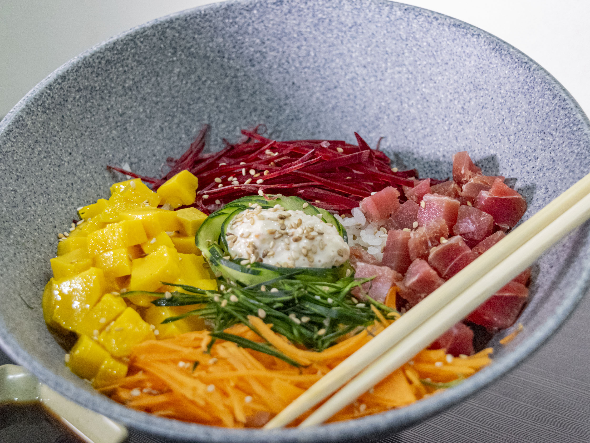 Base arroz, atún, mango, zanahoria, betabel y tampico.