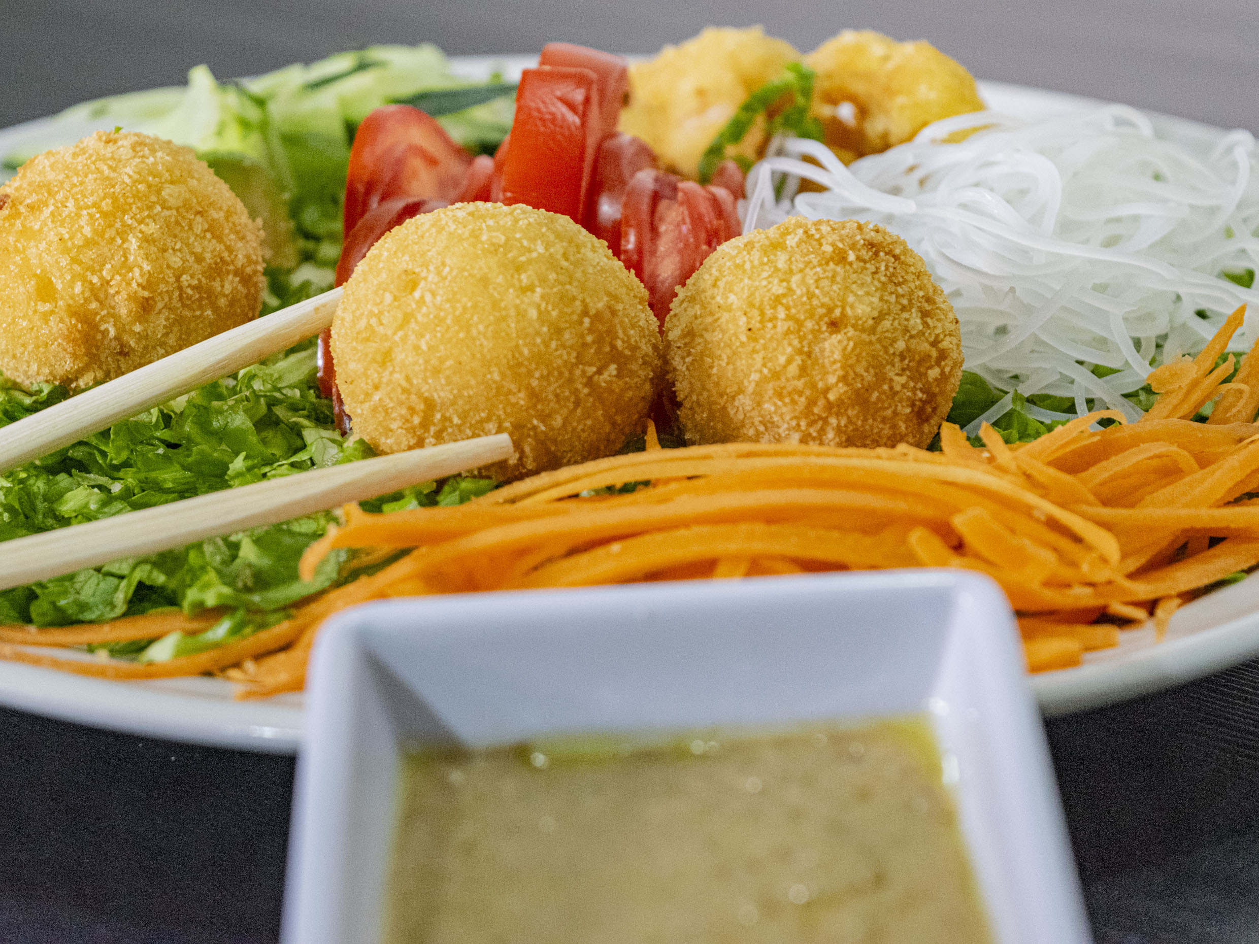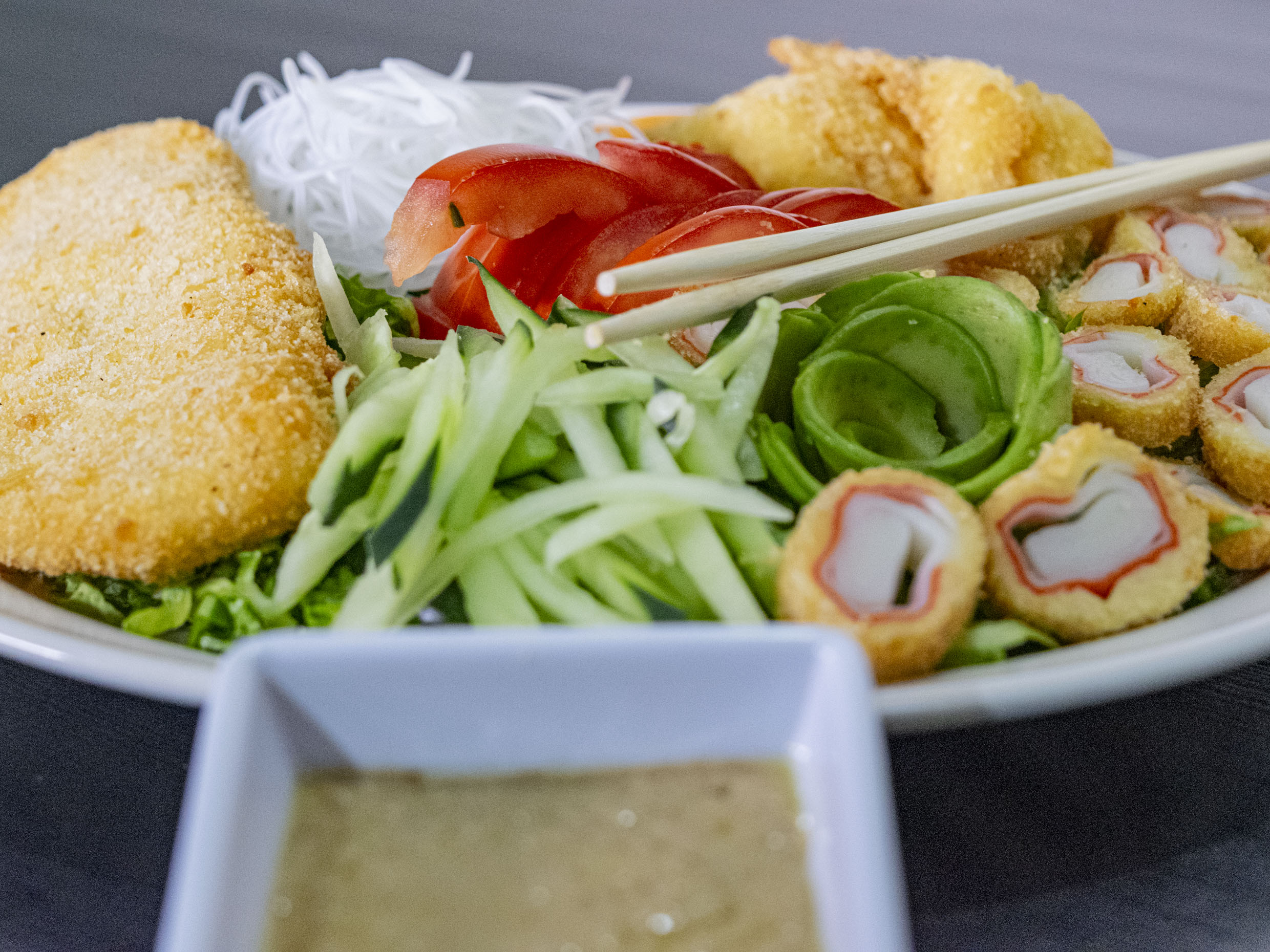 Combinación de tres lechugas con pescado, camarón y cangrejo empanizado.