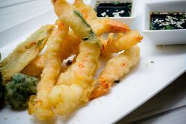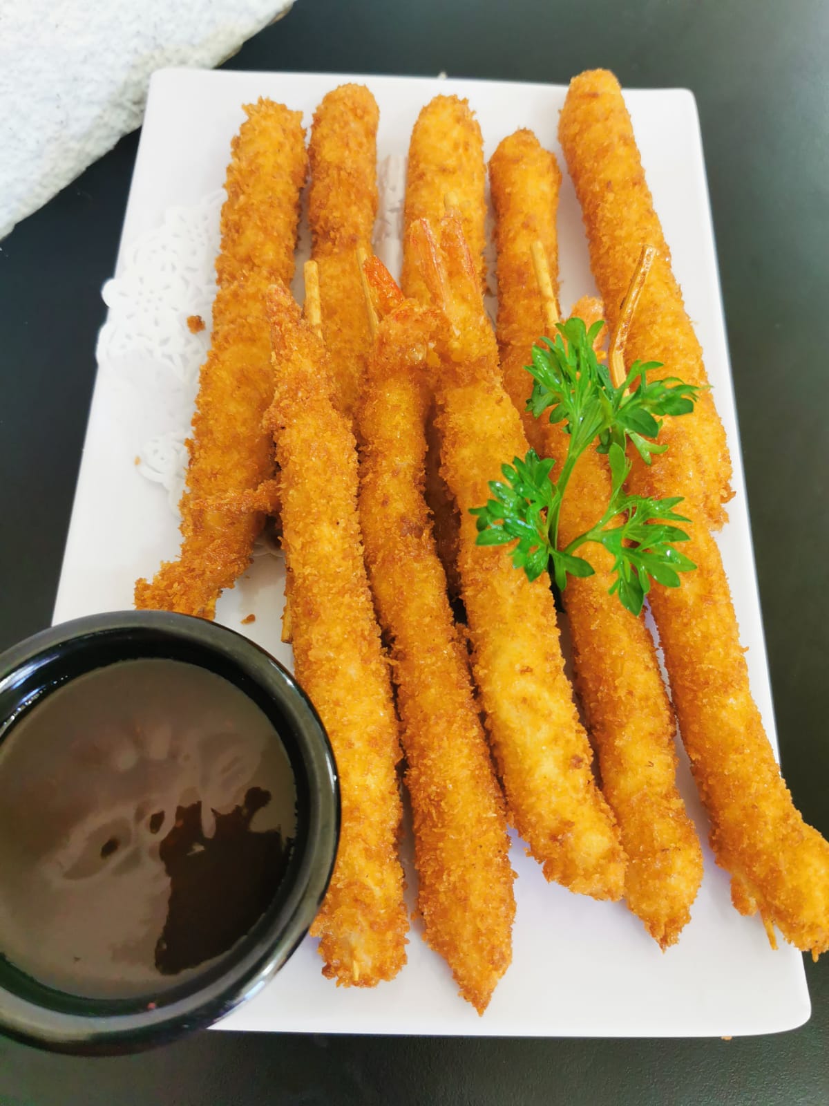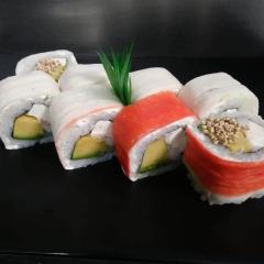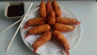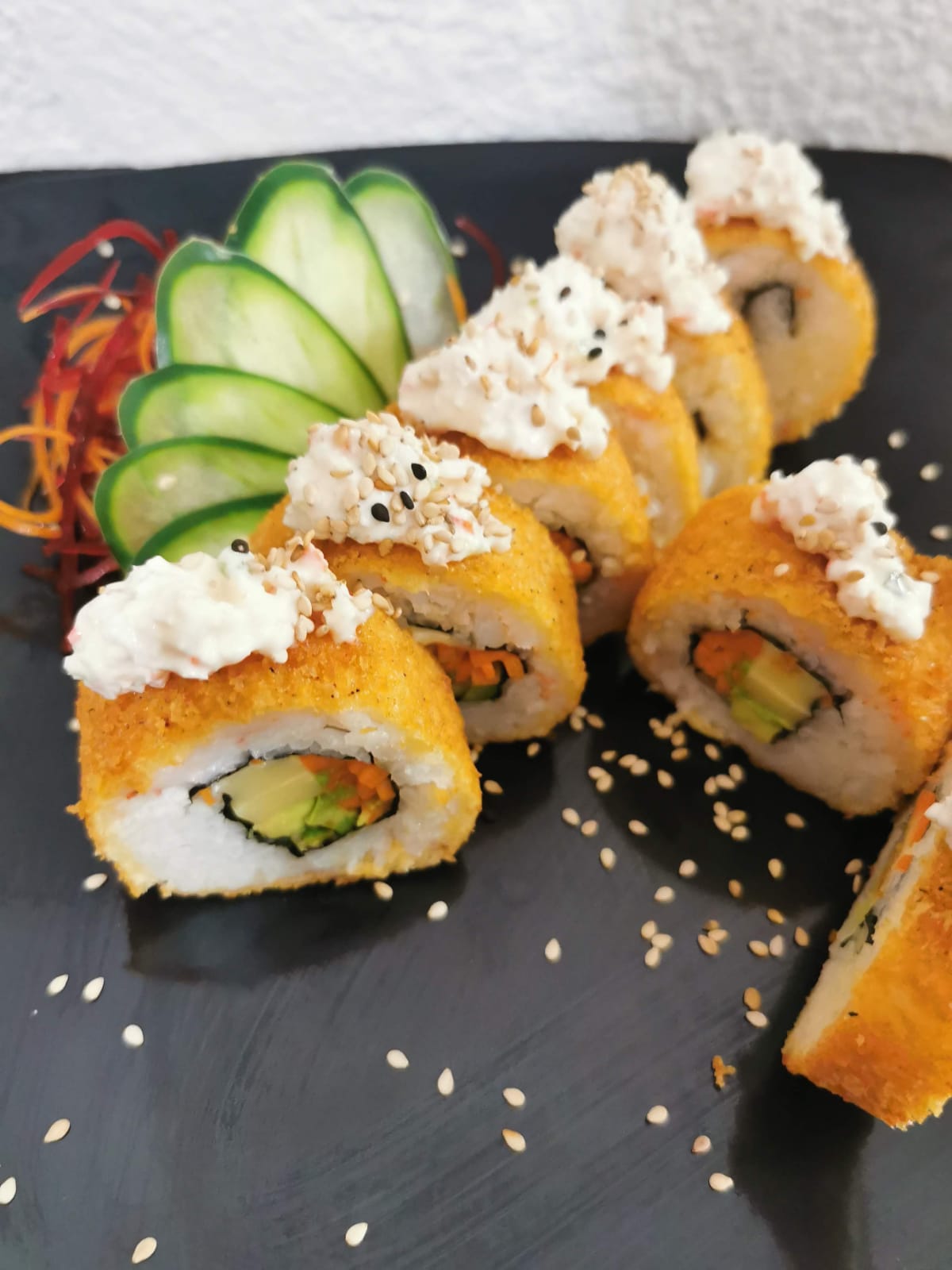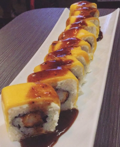 Camarón empanizado, aguacate, queso por fuera, mango y aderezo de chipotle.