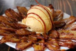 Plátano macho empanizado y helado de vainilla con chocolate.