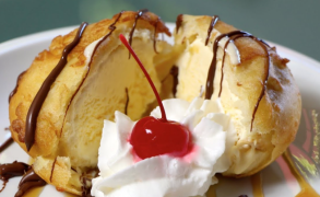 Postre capeado, relleno de helado de vainilla, cubierto con fresa, frambuesa o chocolate.