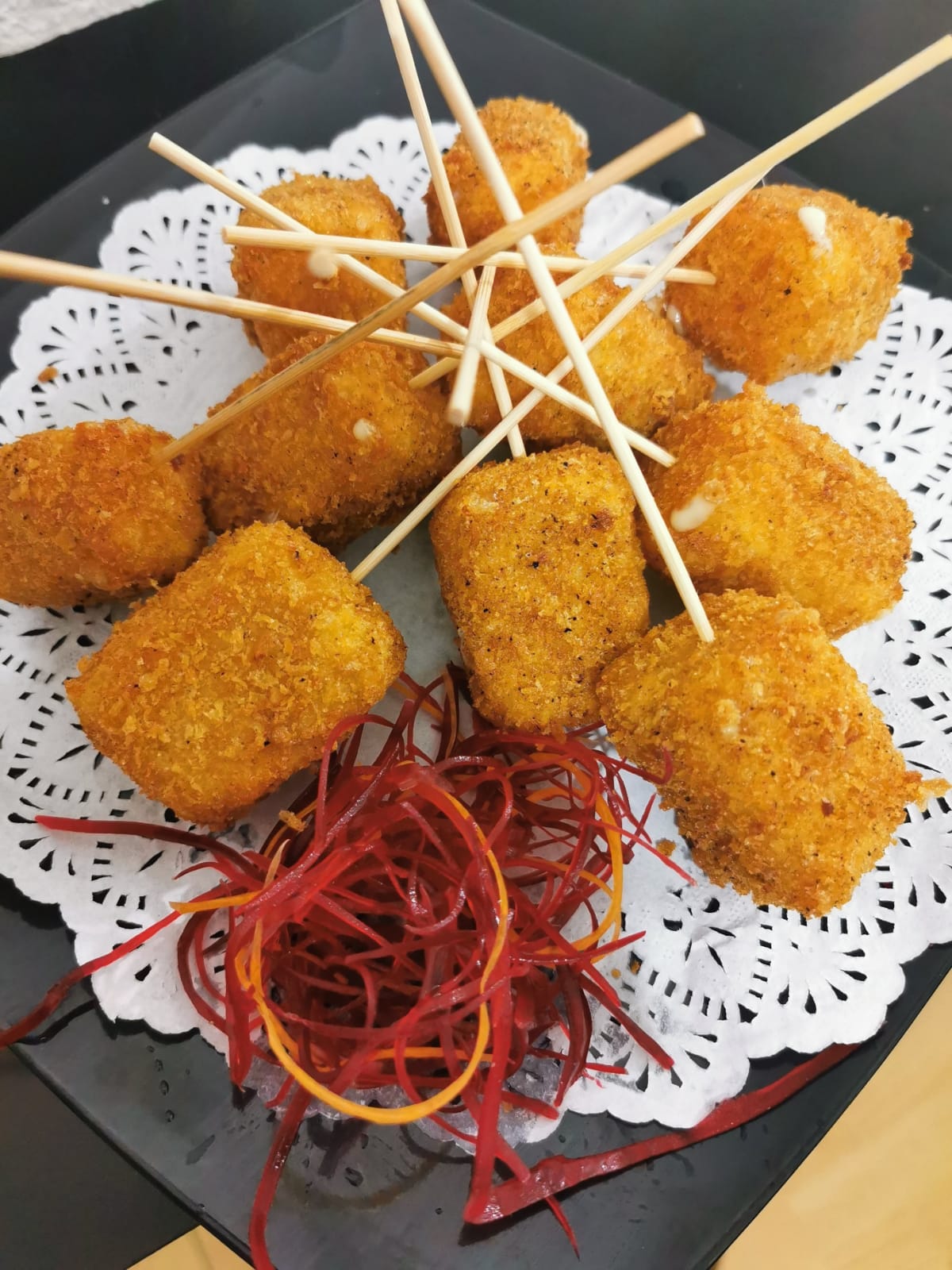 Queso manchego, surimi empanizada, aguacate, chiles toreados y chipotle.