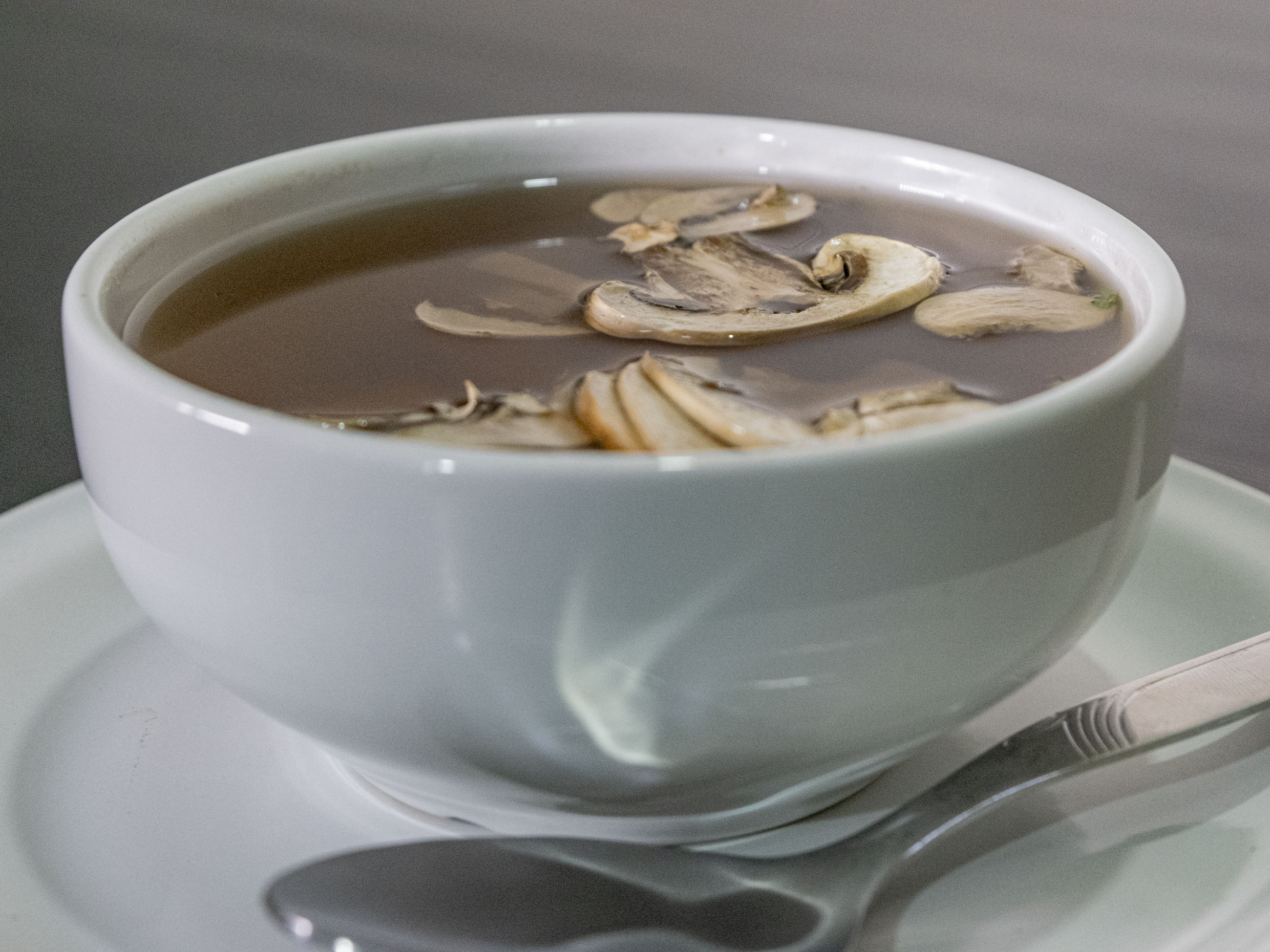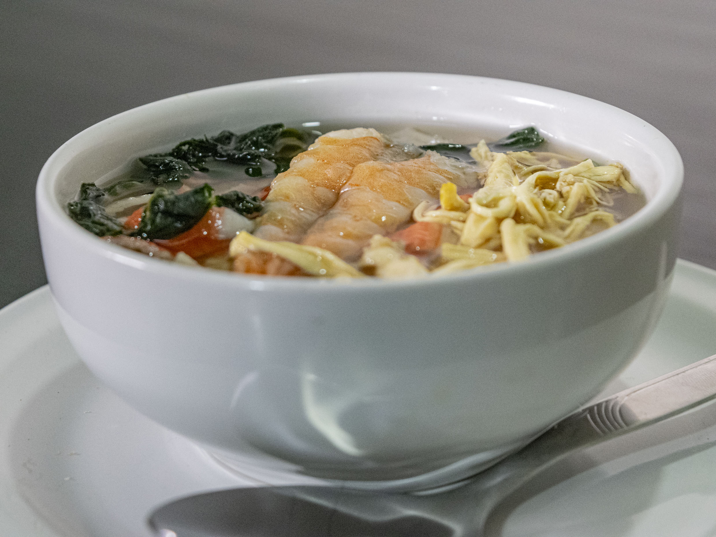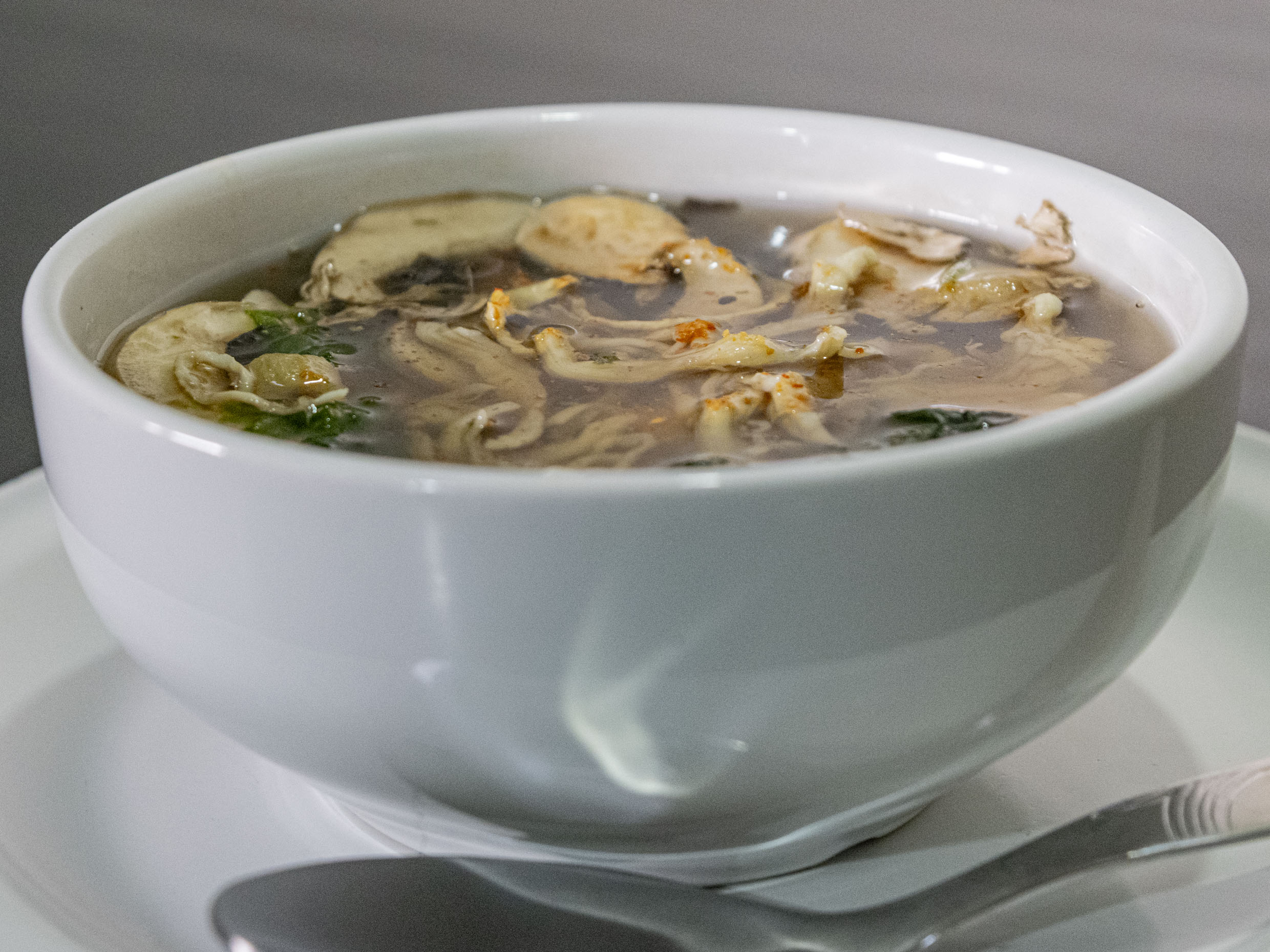 Sopa con pollo, espinaca, champiñón, shishimi e hilitos de huevo y gohan.