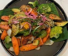Pasta de soba, carne de res, zanahoria, champiñón y cebollín con salsa agridulce.