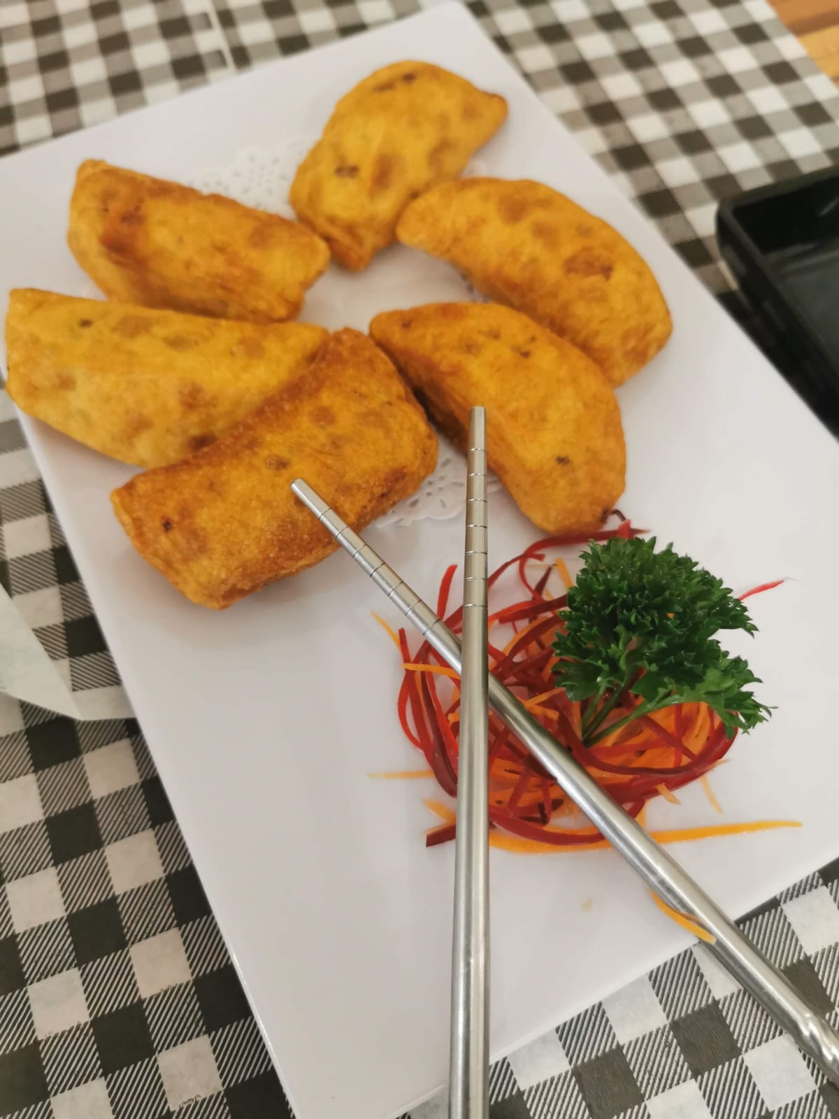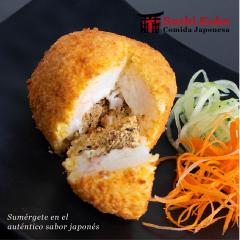 Triángulo de arroz empanizado relleno de camarón, queso y condimento de salmón.