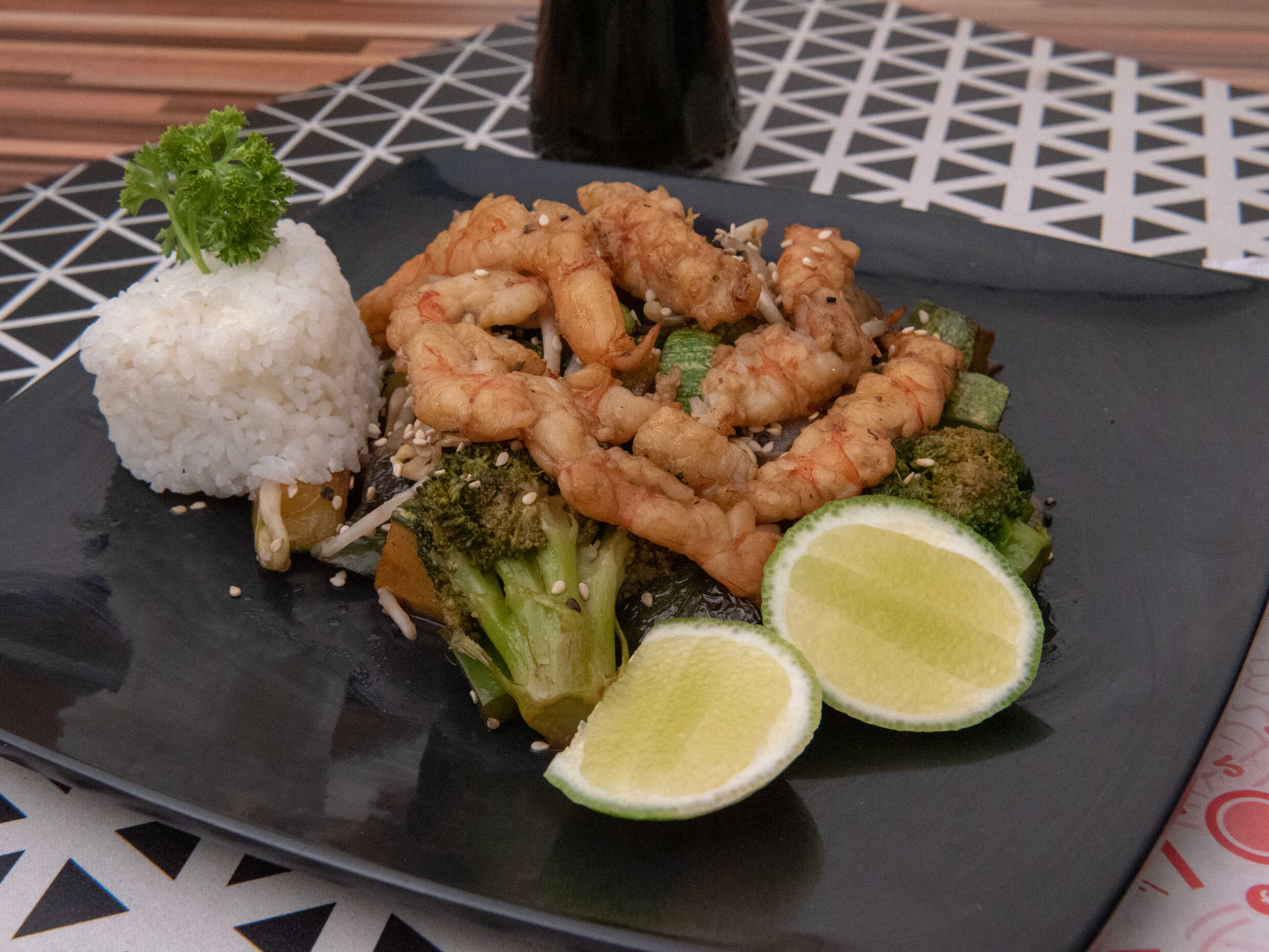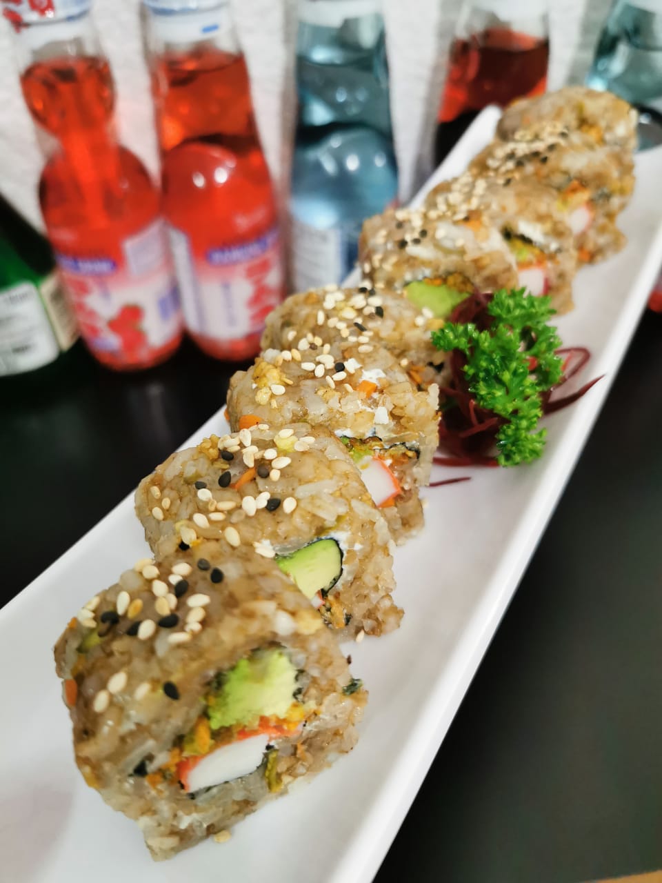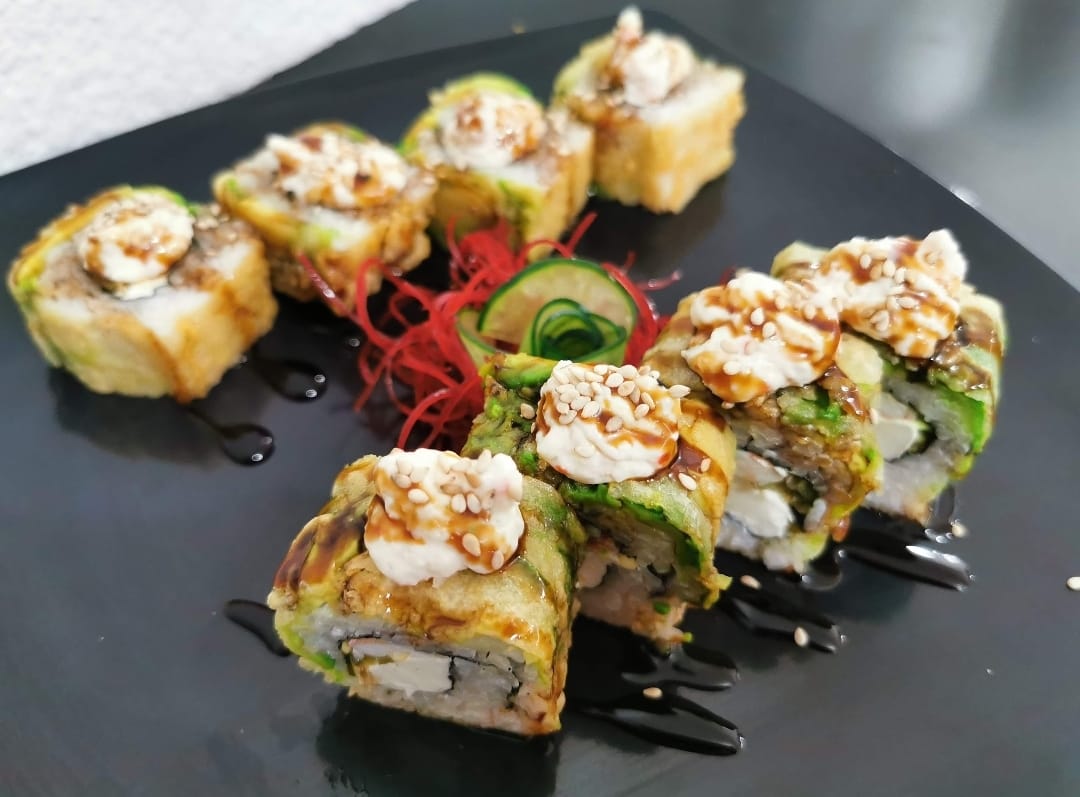 Surimi, kakiage, aguacate, chiles toreados, arroz de yakimeshi y queso crema.