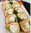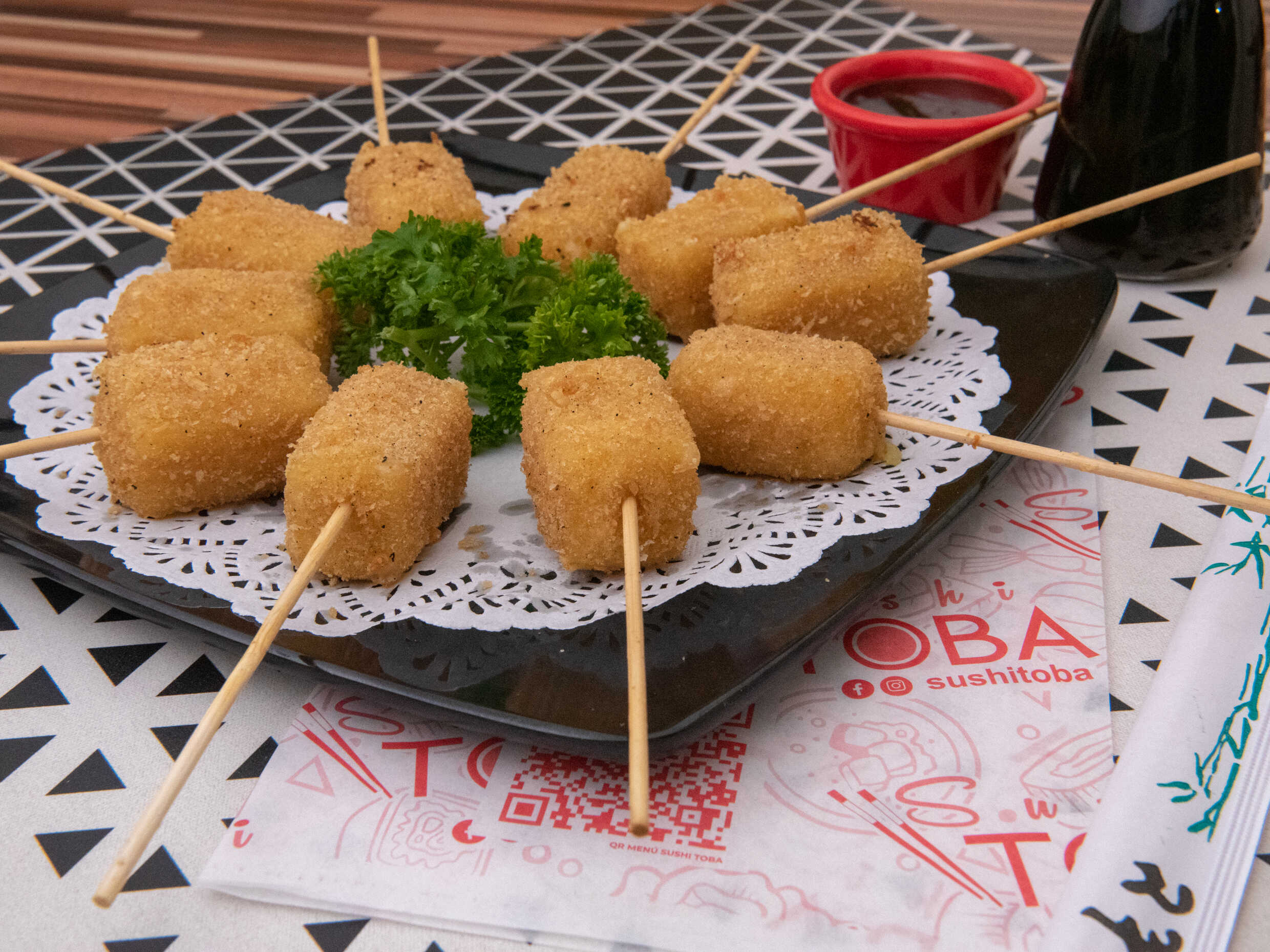 Queso manchego, surimi empanizado, aguacate, chiles toreados y chipotle.