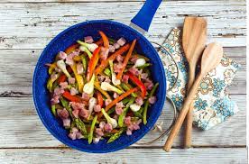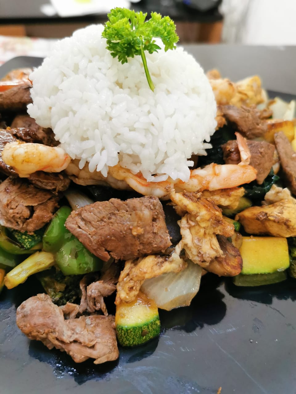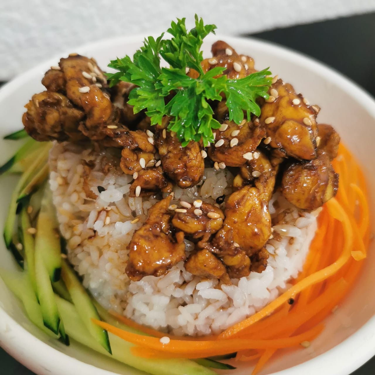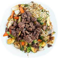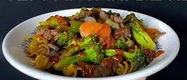 Pasta de soba, carne de res, zanahoria, champiñón y cebollín con salsa agridulce.
