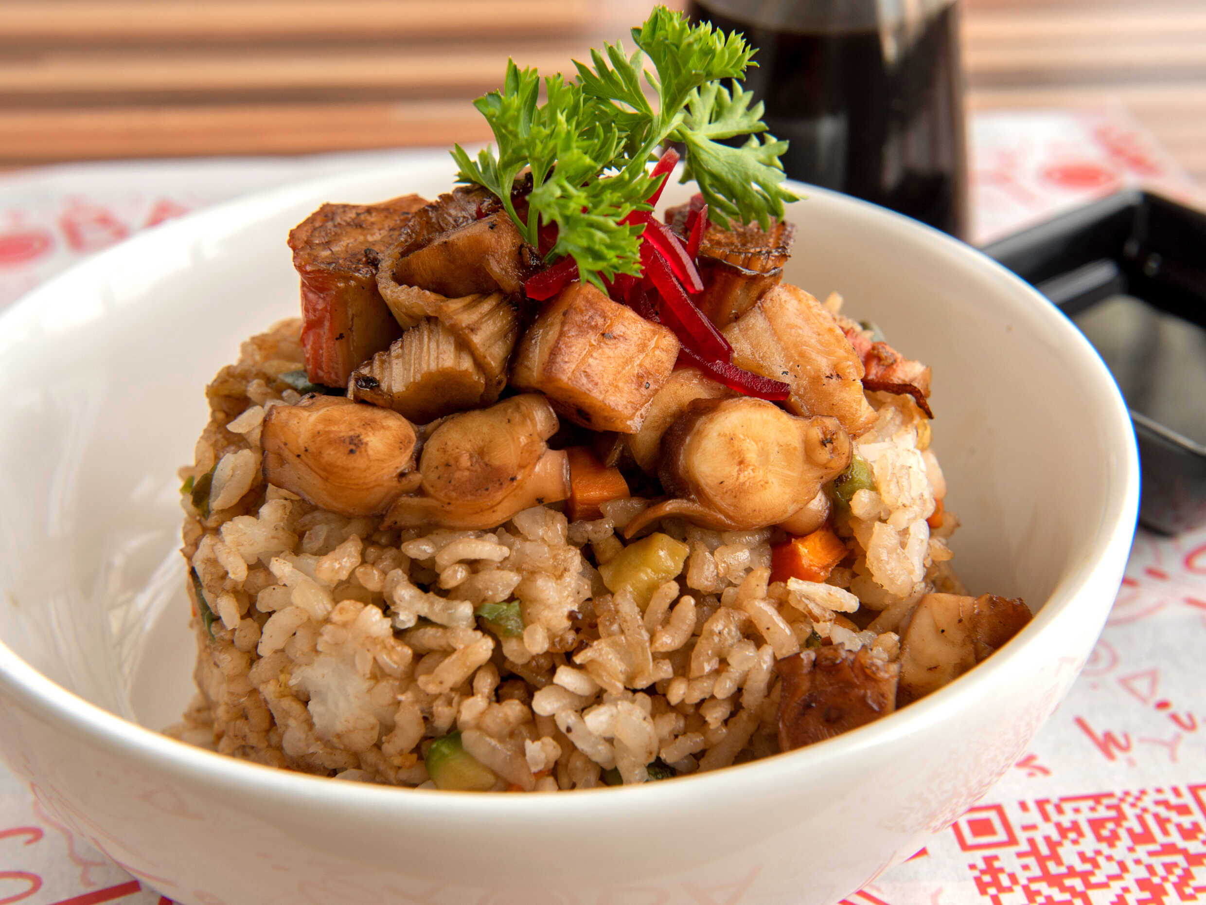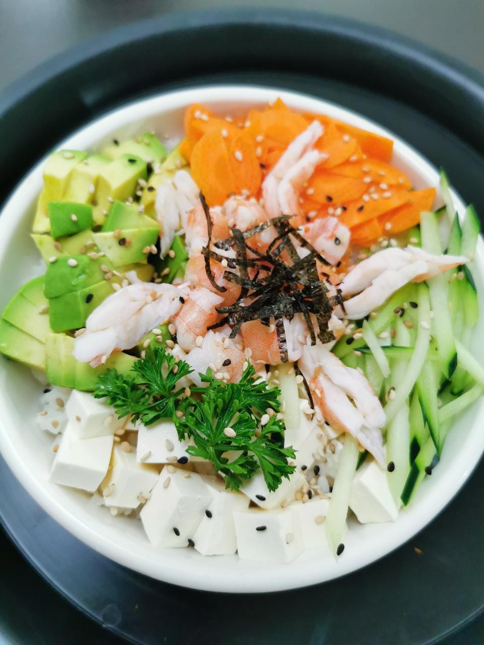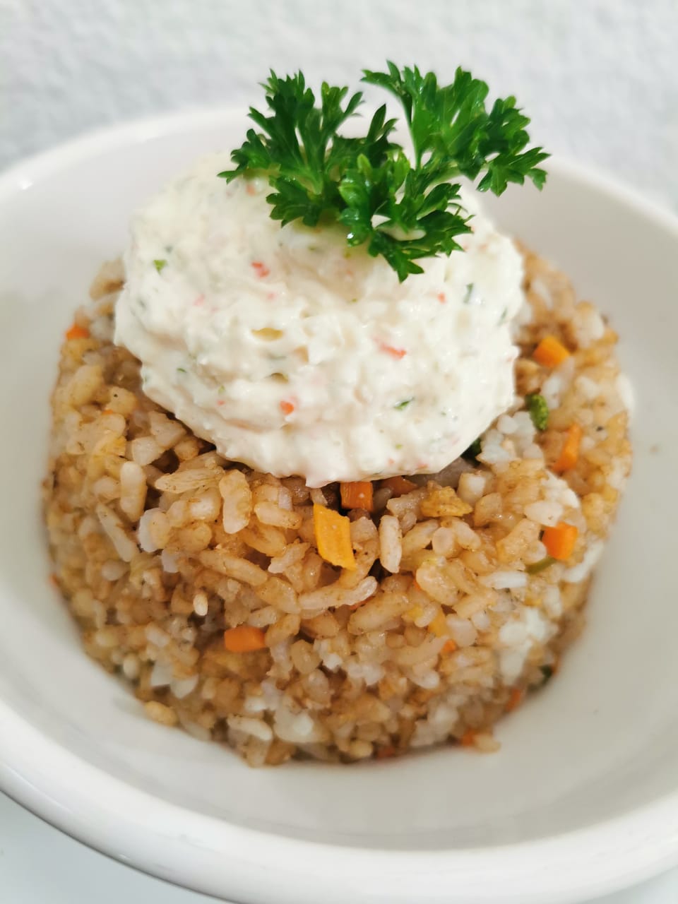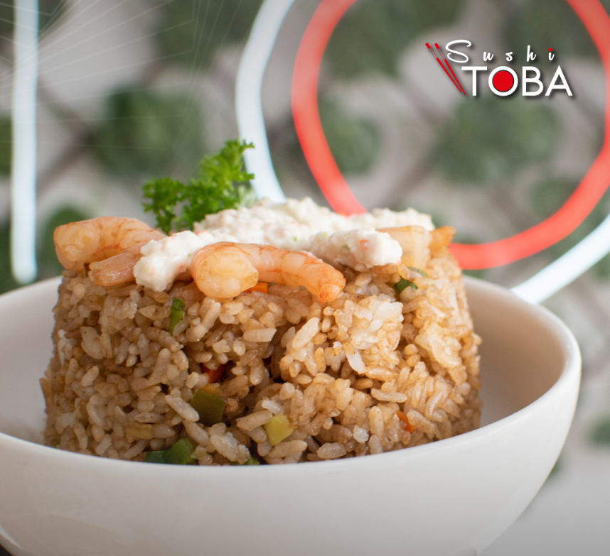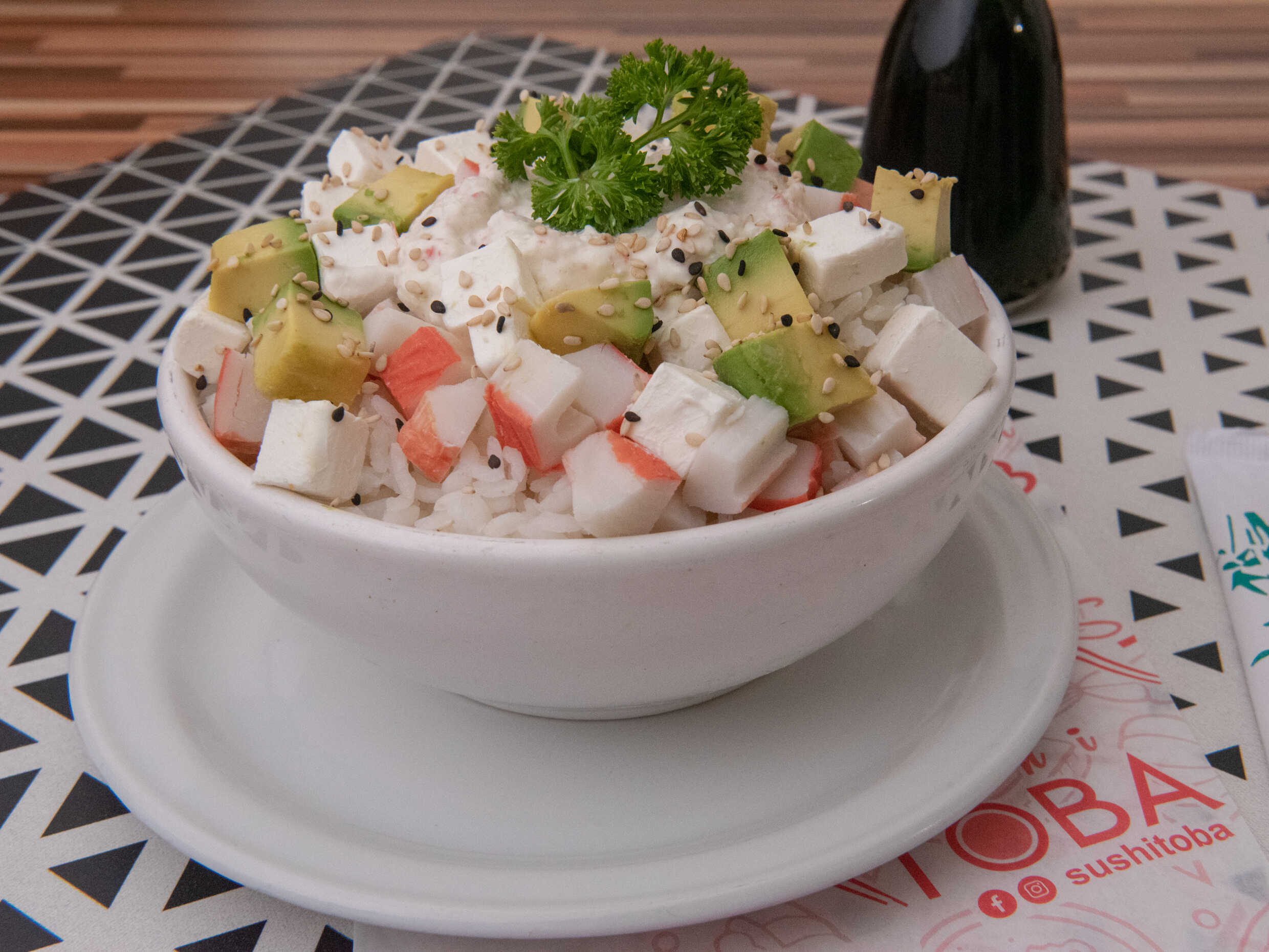 Arroz al vapor con surimi, Tampico, aguacate y queso Philadelphia.