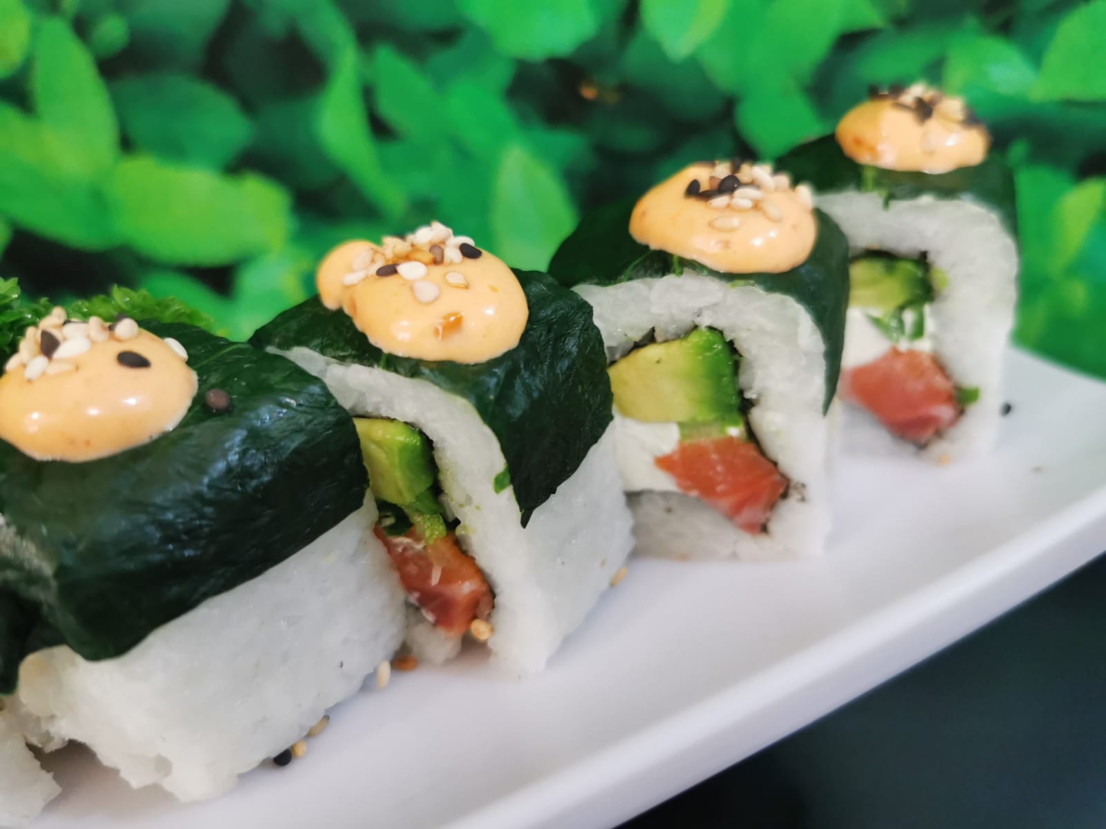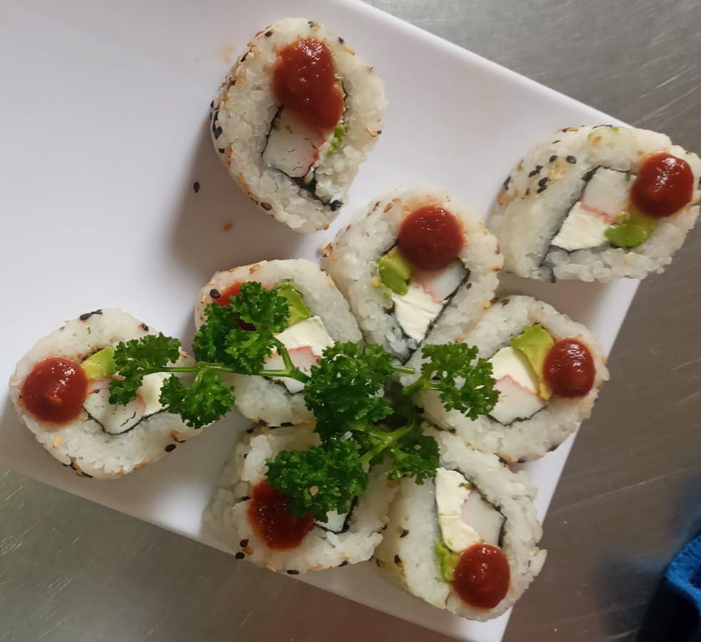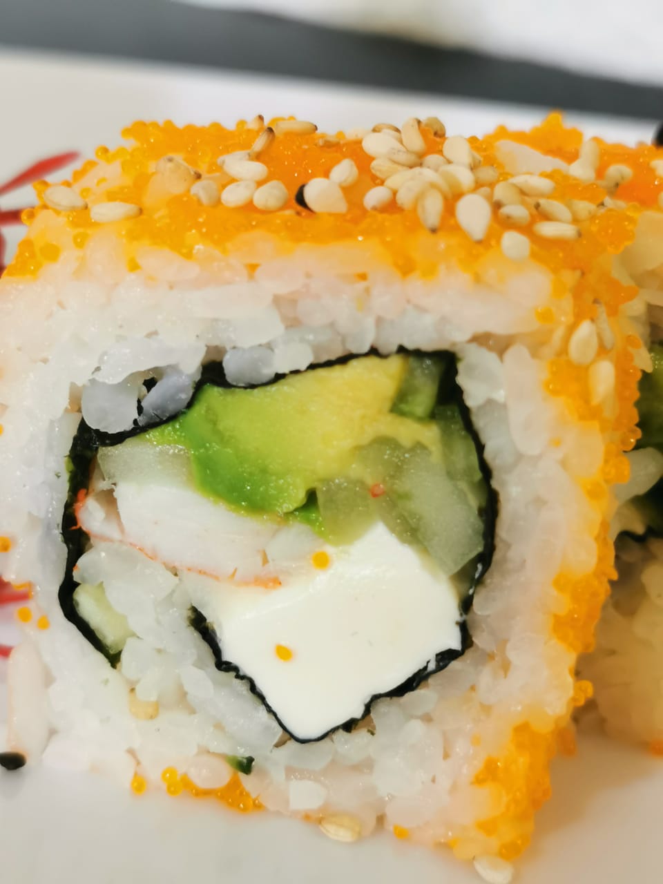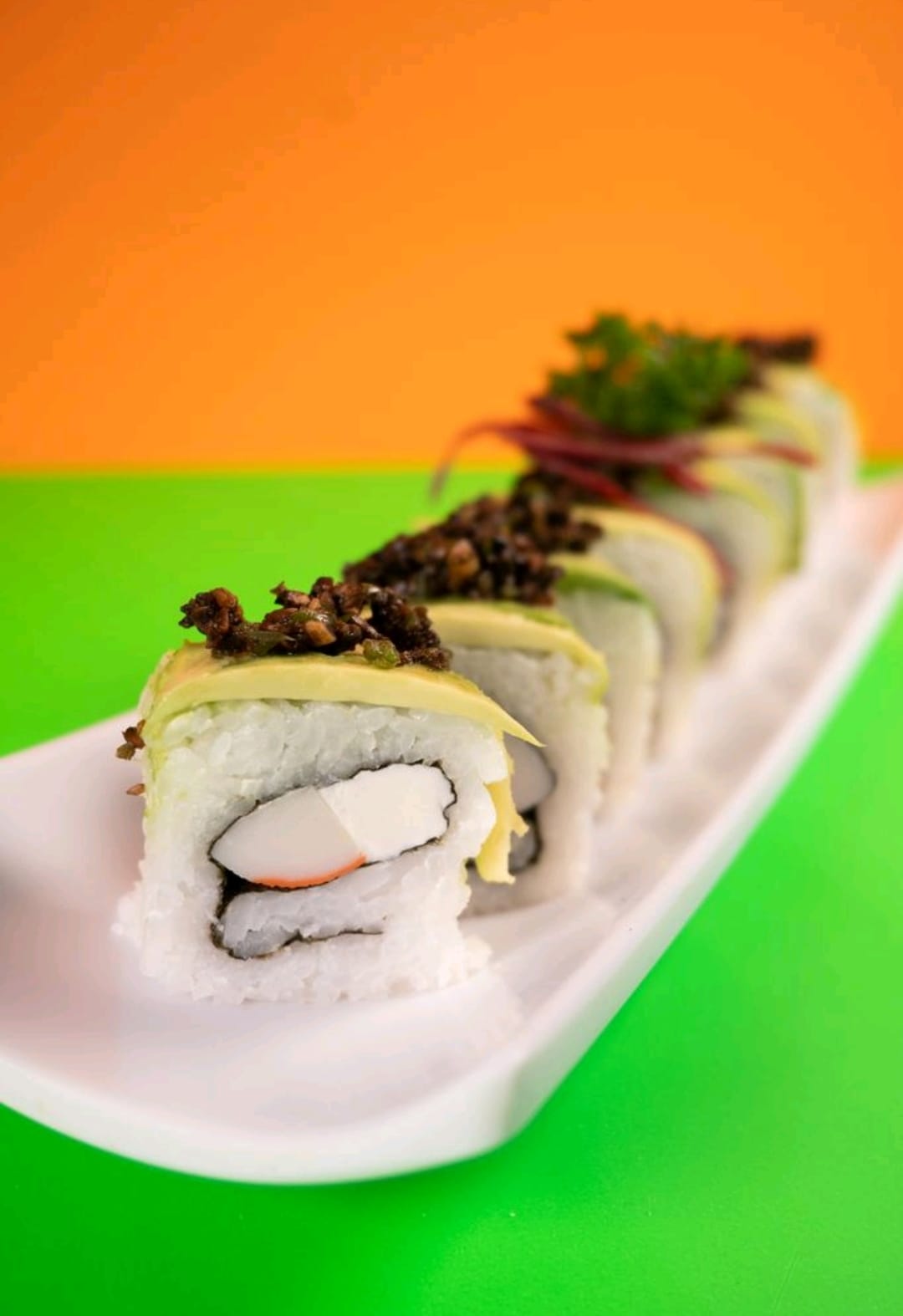 Por fuera aguacate, por dentro surimi, queso crema y encima salsa especial de champiñón.