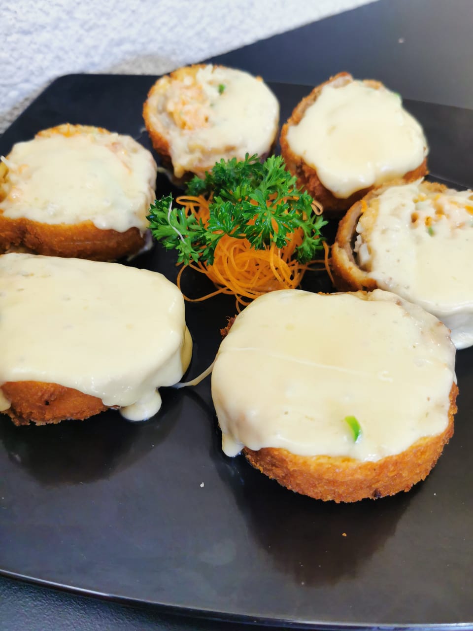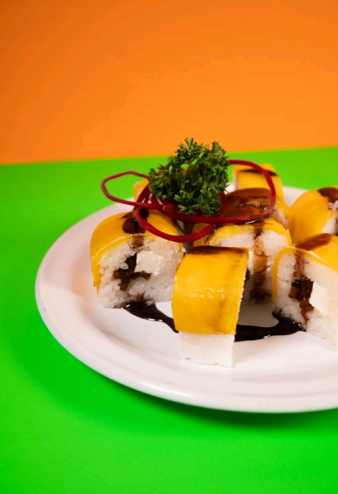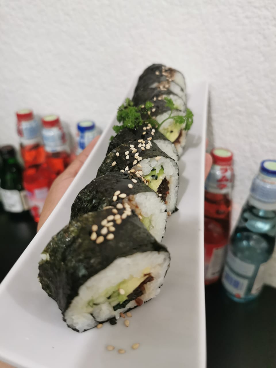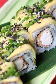 Por fuera aguacate, por dentro surimi, queso crema y encima salsa especial de champiñón.