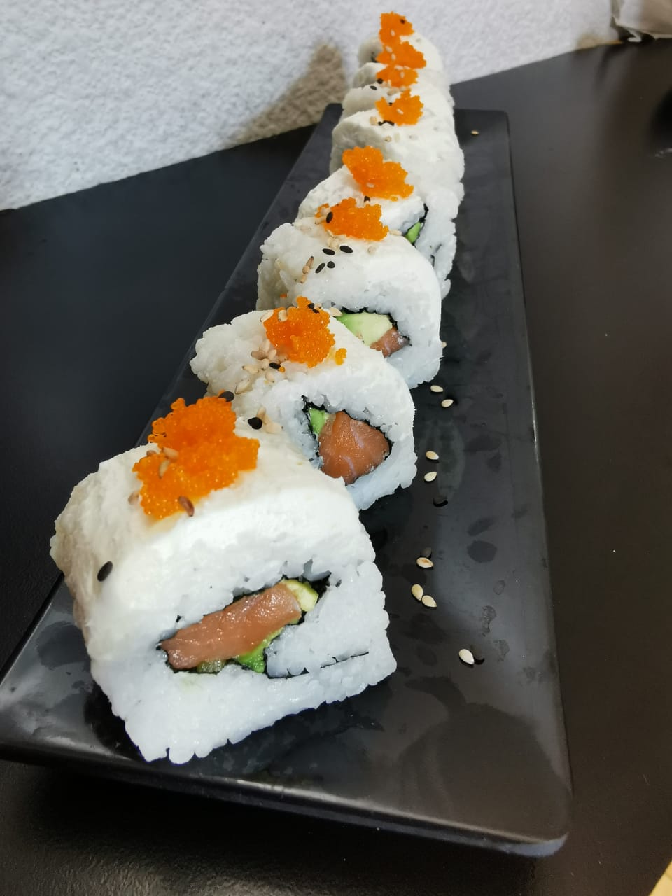 Salmón, cebollín, aguacate, queso crema, masago y chiles toreados.