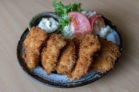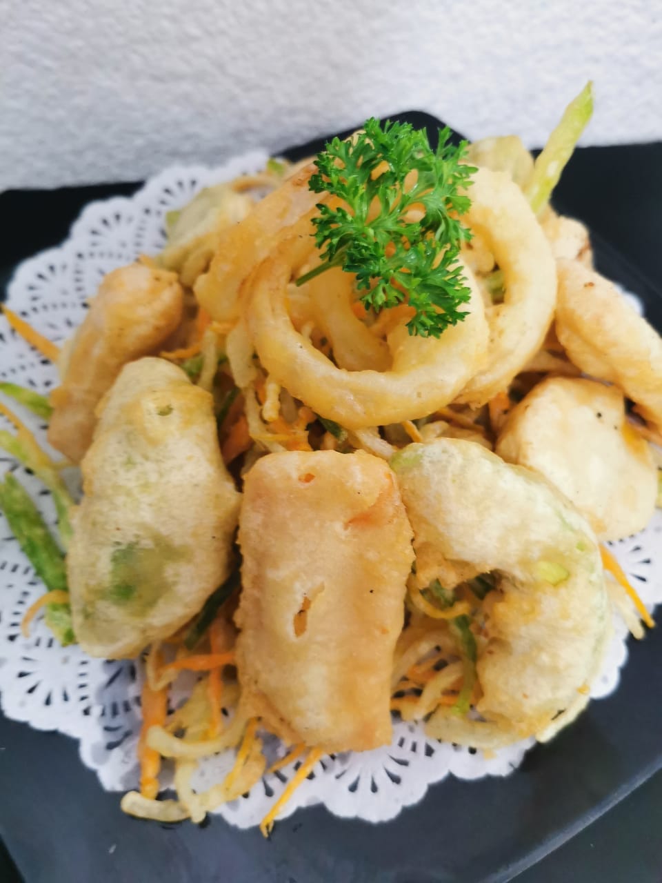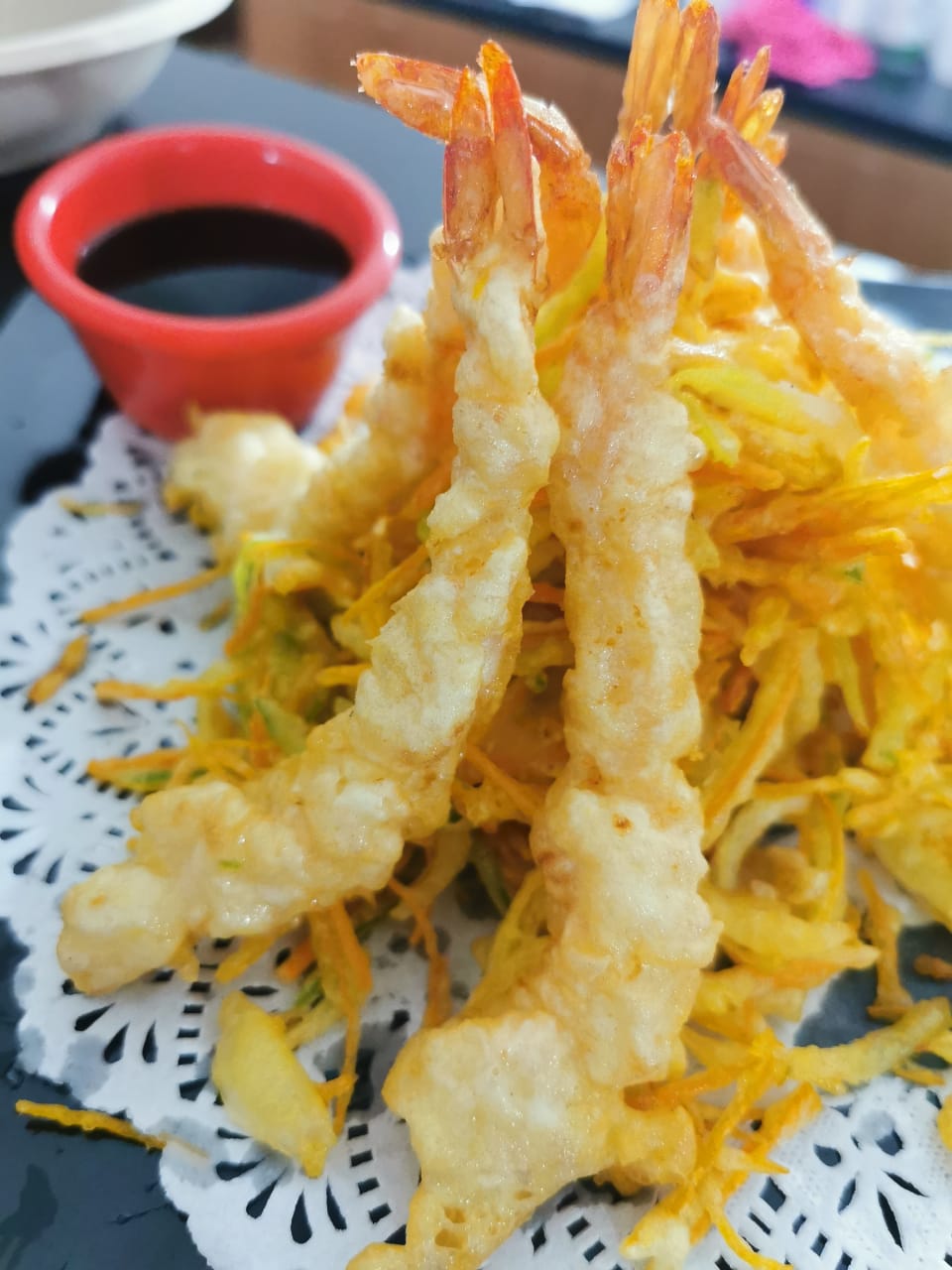Kakiage, queso crema, camarones al ajillo, aguacate, Tampico y salsa chipotle.