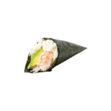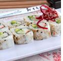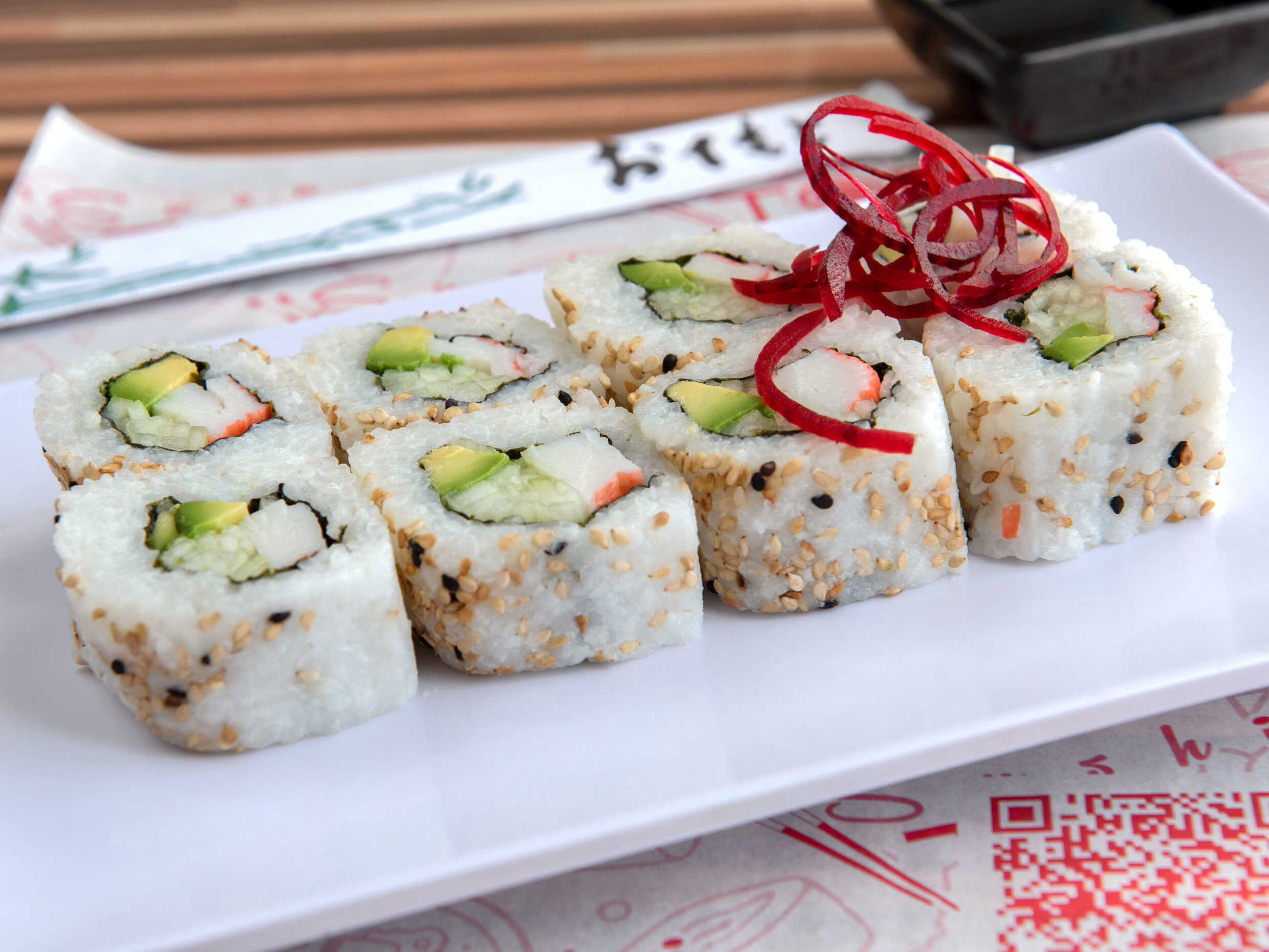 Base de arroz, queso crema, camarón salteado, pepino, aguacate y zanahoria.