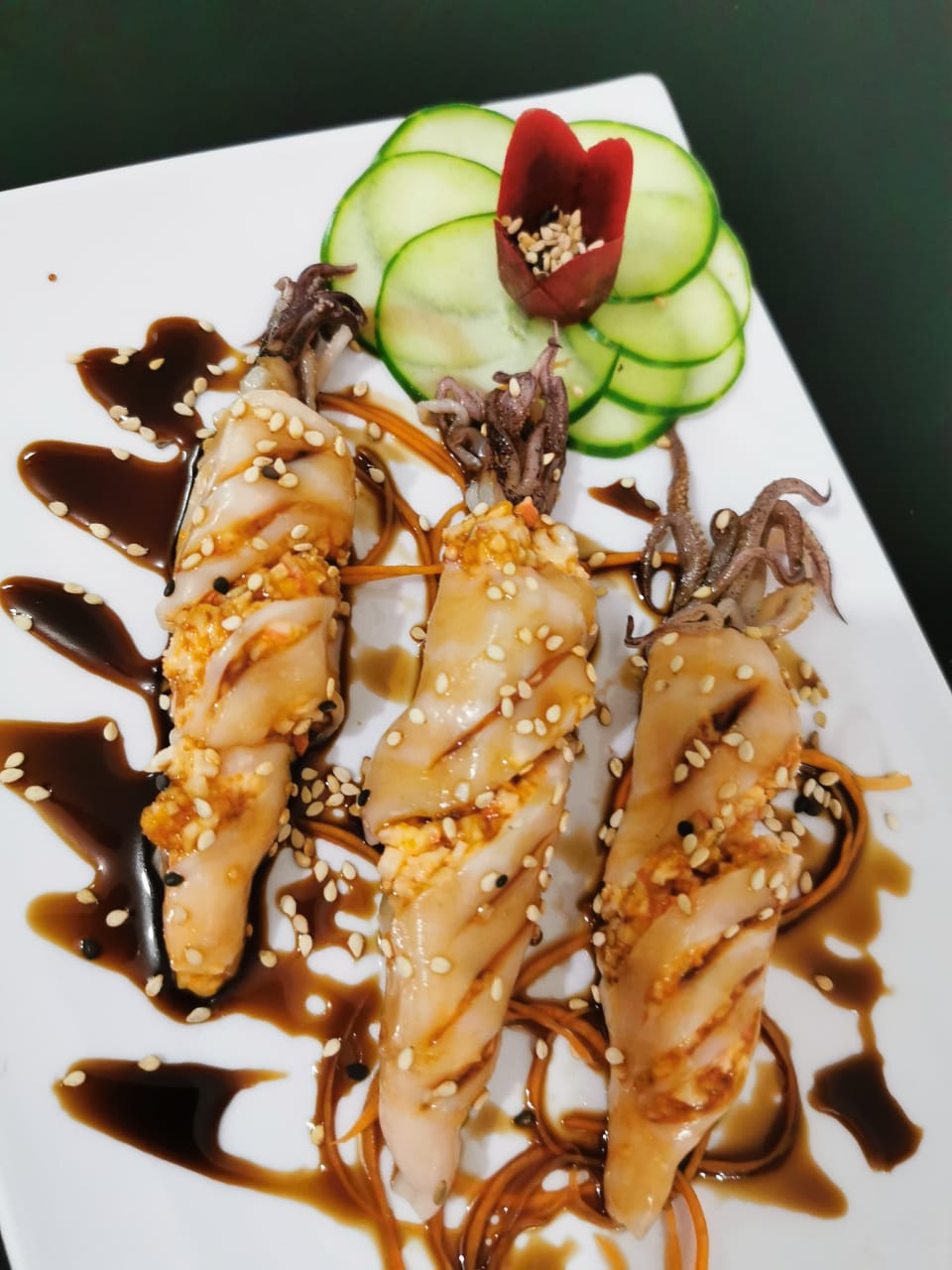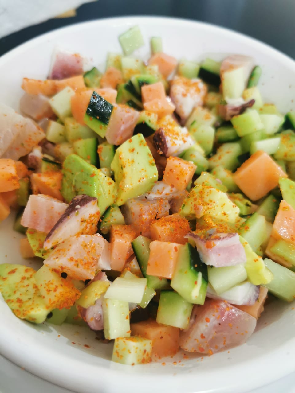 Pescado, salmón, pulpo, pepino, aguacate y salsa especial.