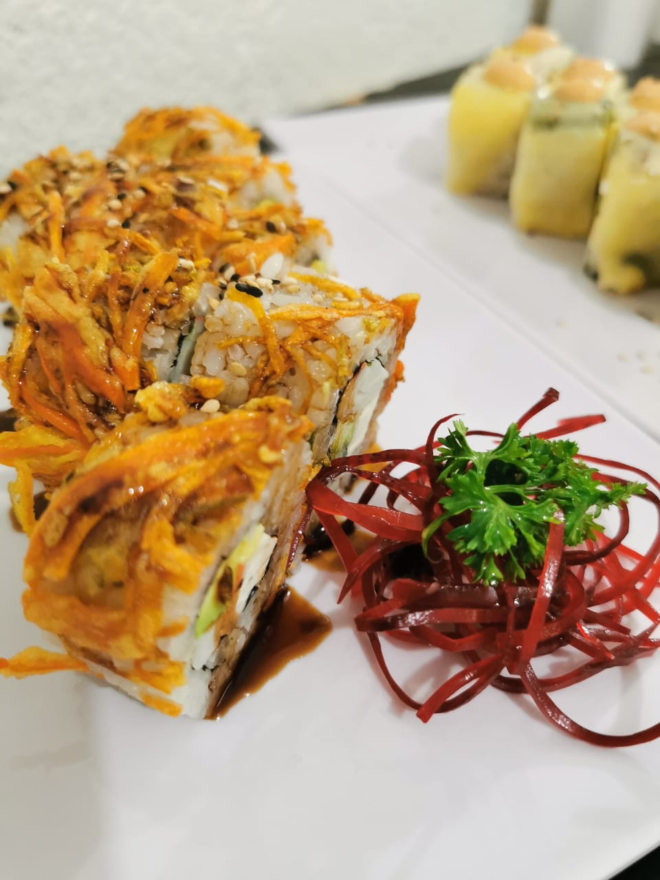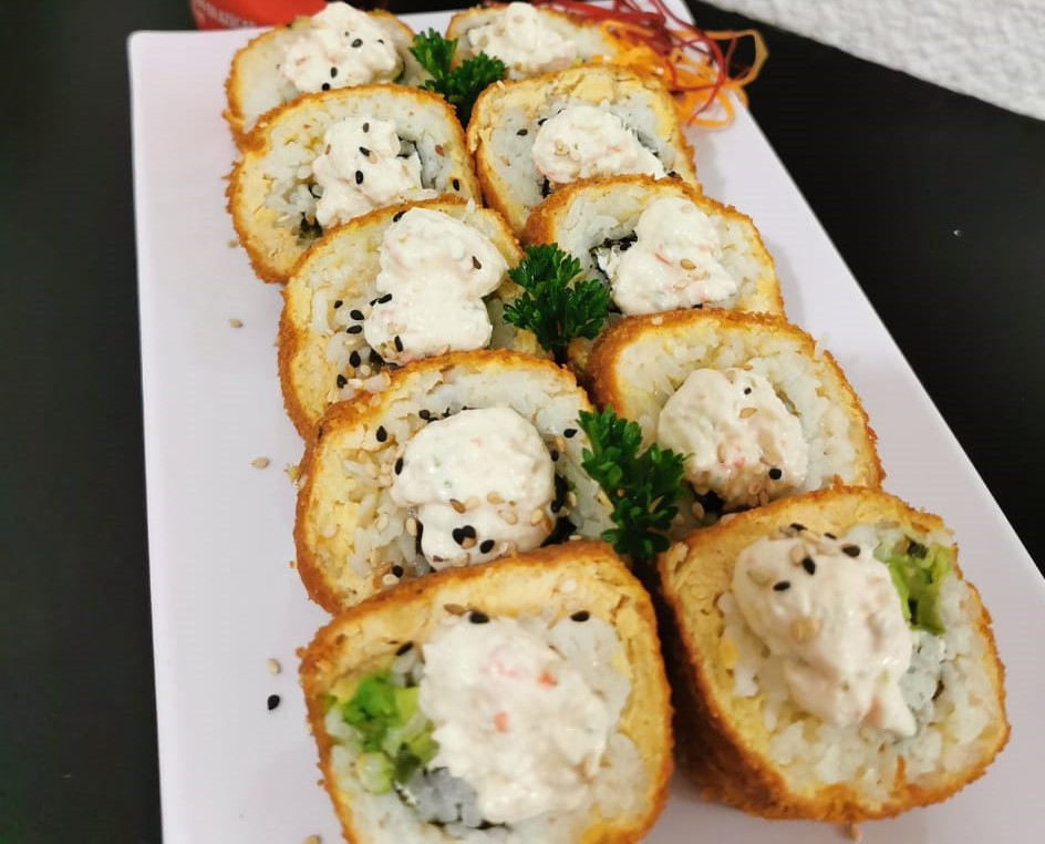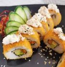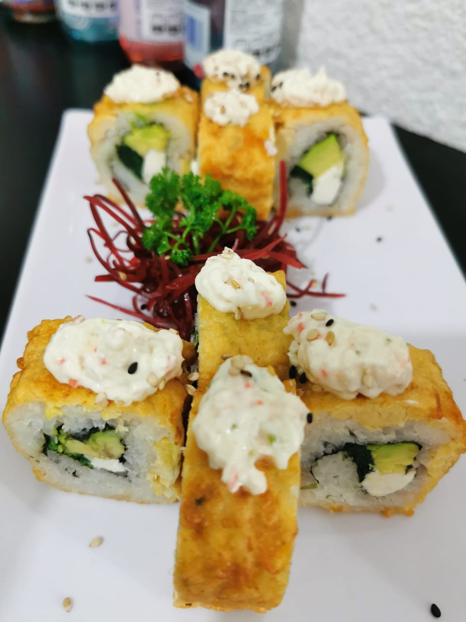Maki XL empanizado relleno de salmón tempura, aguacate y queso crema, acompañado con tampico y salsa especial