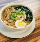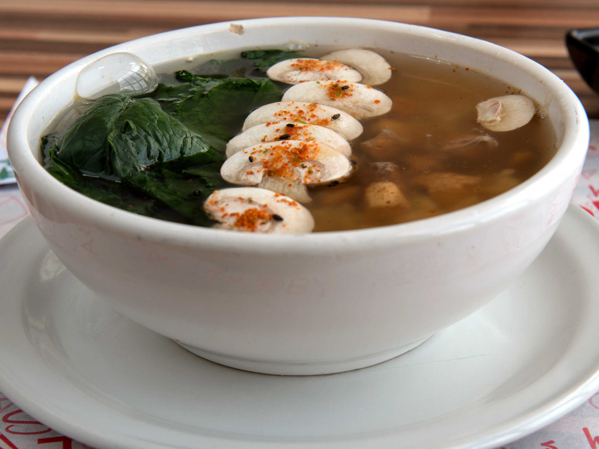 Sopa con pollo, espinaca, champiñón, sashimi e hilitos de huevo y gohan.