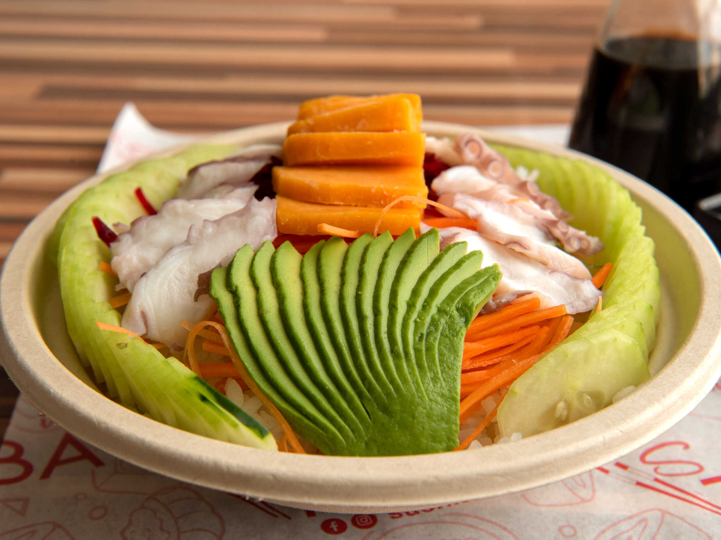 Base de arroz, aguacate, zanahoria, pepino, mango, surimi, betabel y pulpo