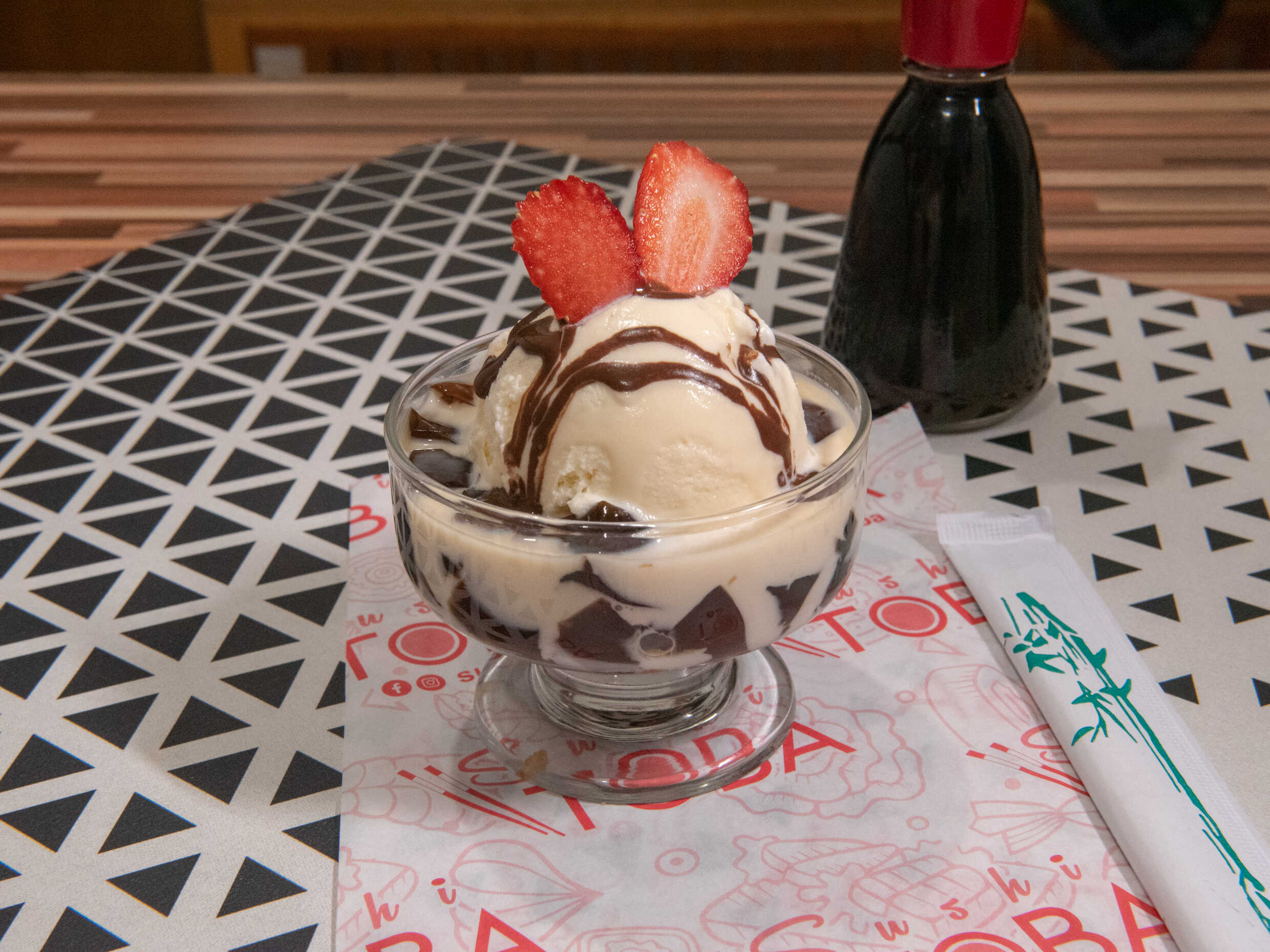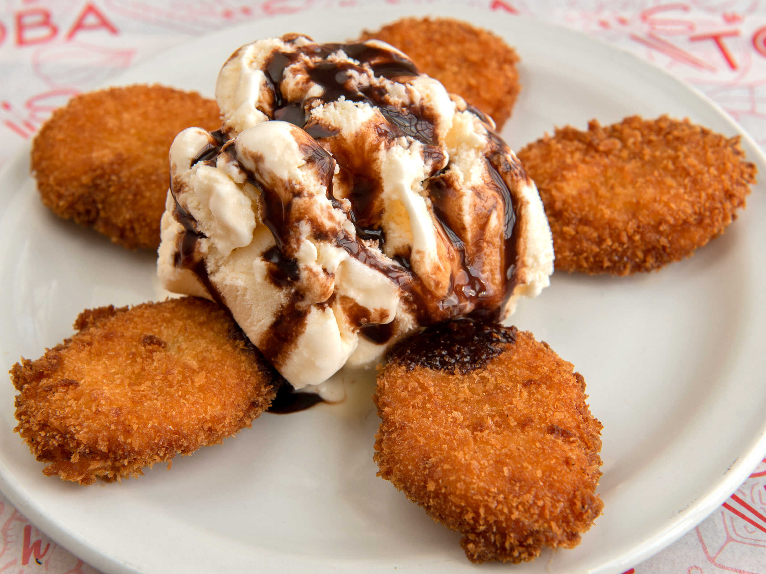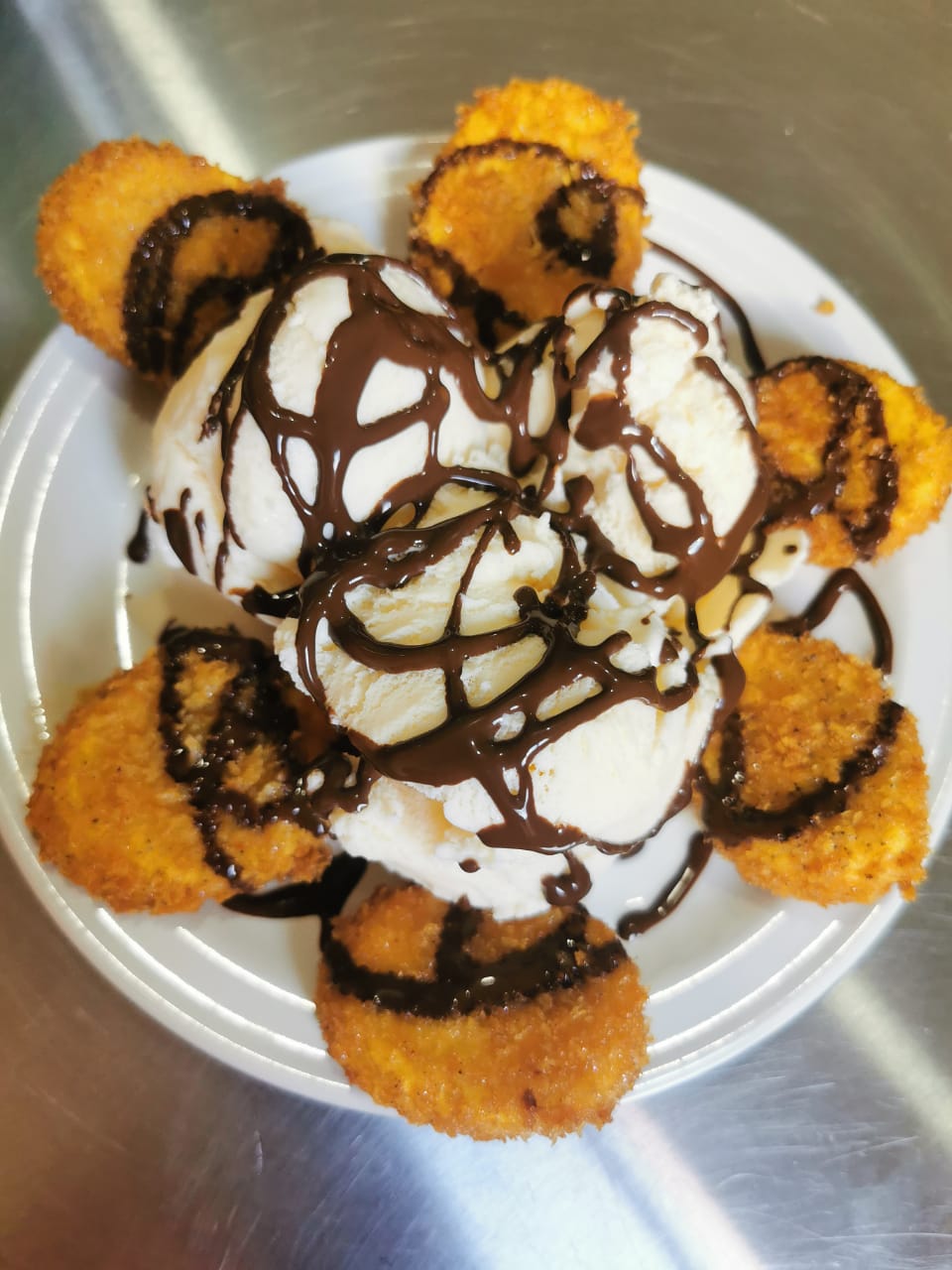 Plátano macho empanizado y helado de vainilla con chocolate.