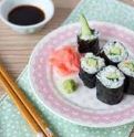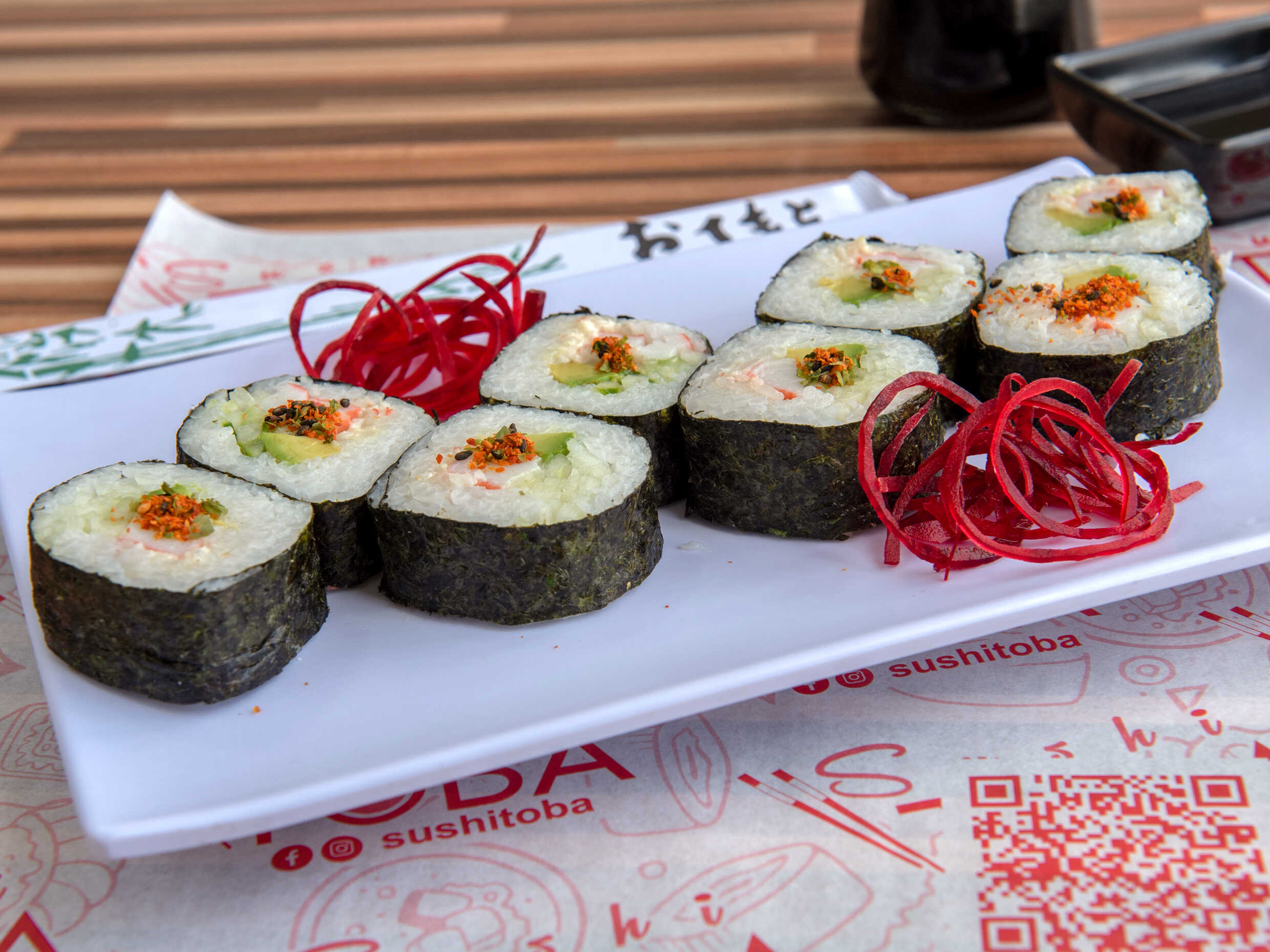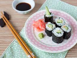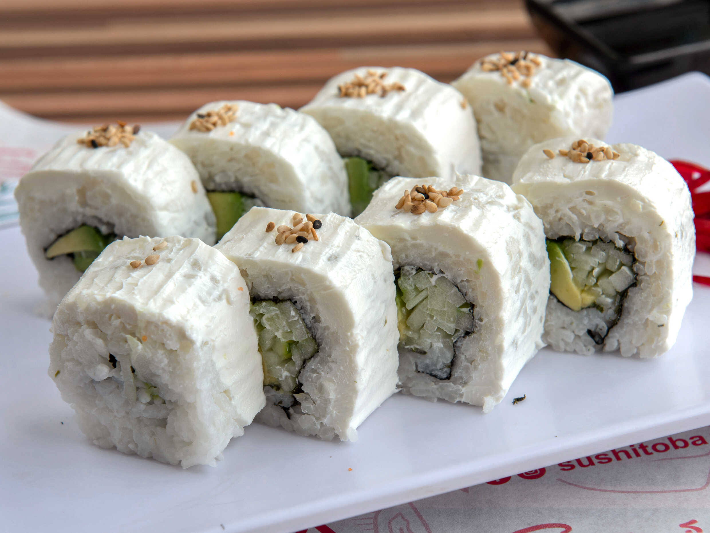 Base de arroz, queso crema, aguacate, betabel y pepino.