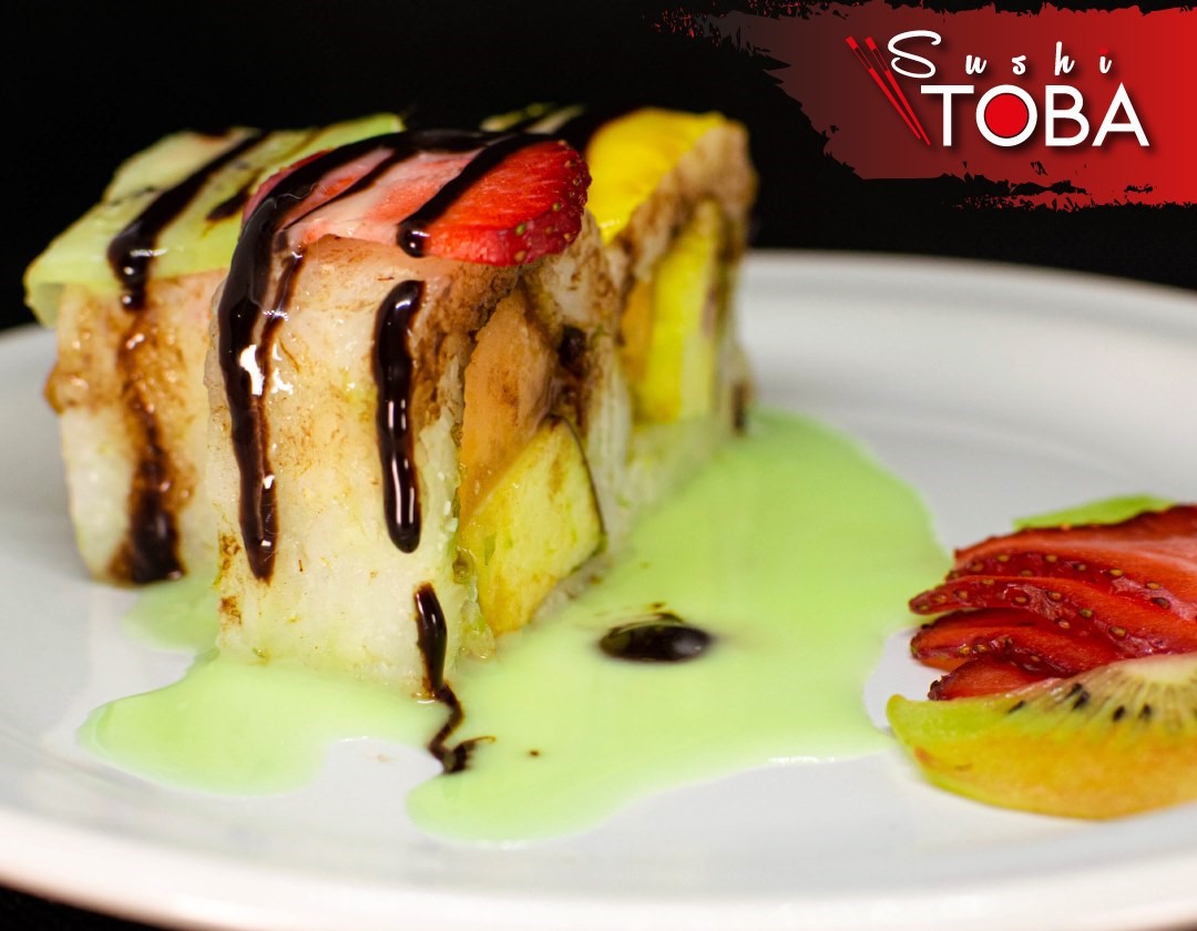 Queso, mango, fresa, kiwi y crema de melón por fuera, piña, manzana y melón por dentro (Sólo temporada).