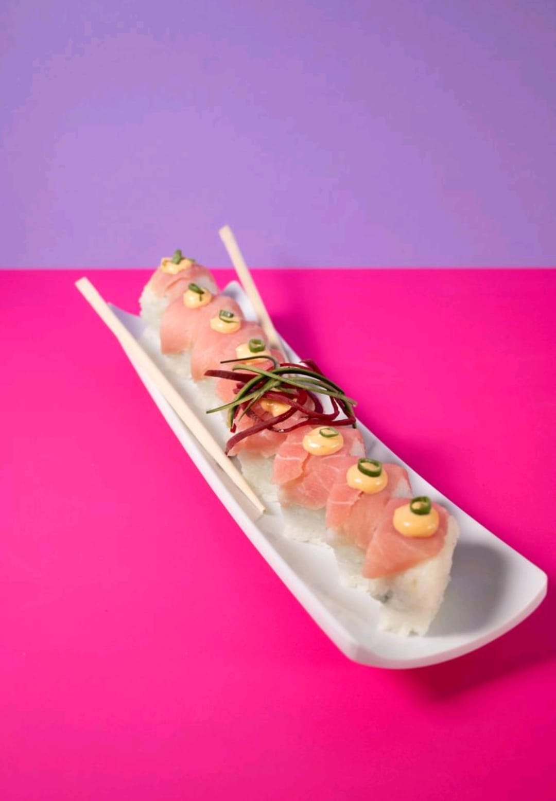 Atún fresco por fuera, por dentro queso crema, aguacate y pepino.