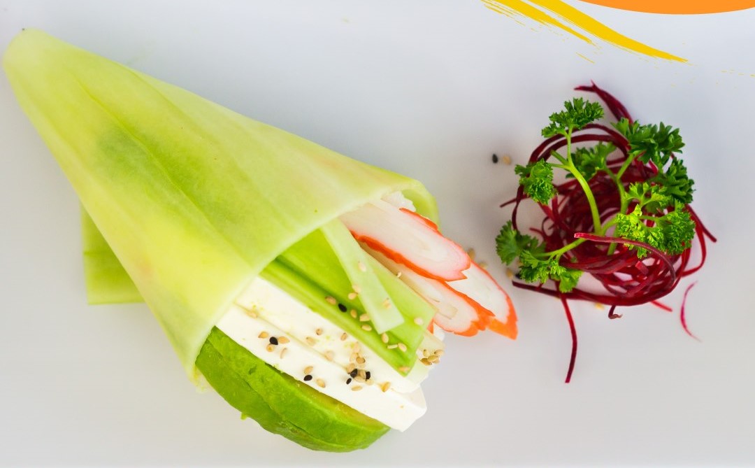 Cangrejo acompañado con lluvia de primavera, ajonjolí y pepino rallado, sobre finas láminas de melón y aderezo con vinagre dulce.