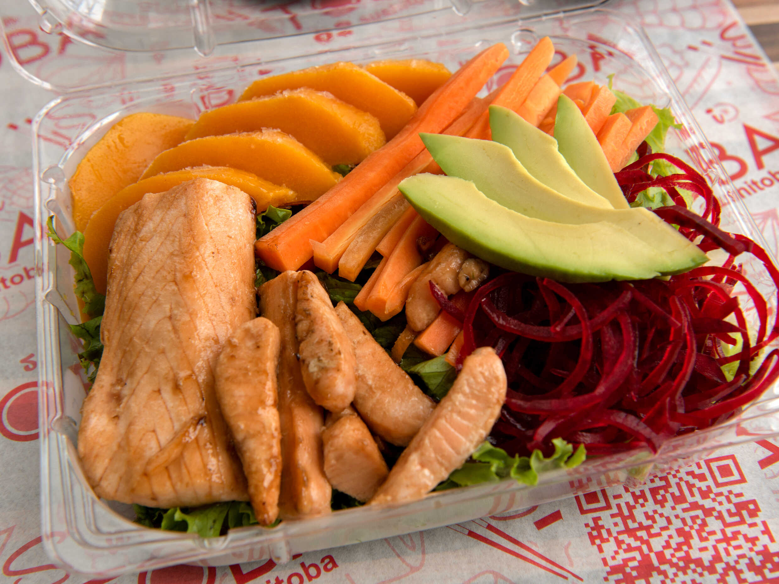 Salmón, lechuga, mango, fresa, betabel, zanahoria y aguacate.
