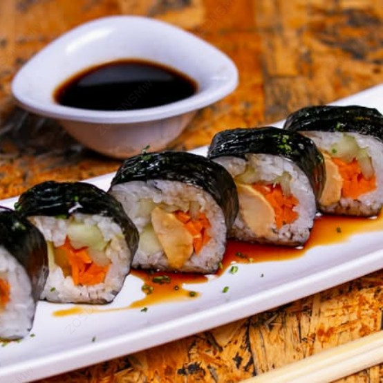 Combinación de pepino, aguacate, queso, plátano y zanahoria con alga y salsa de anguila.
