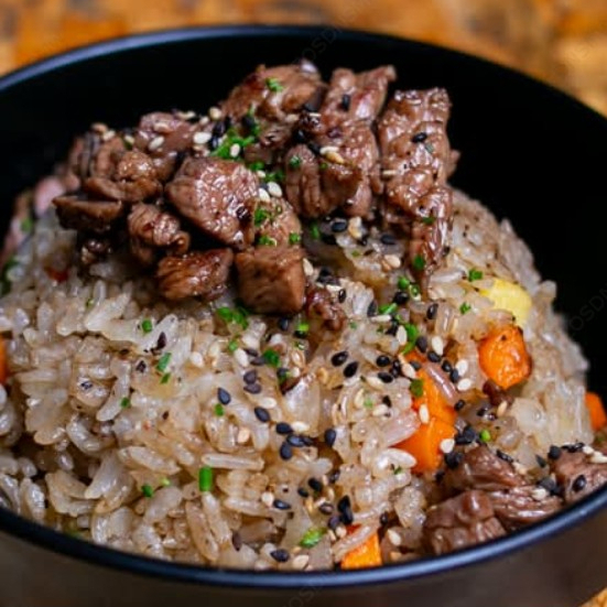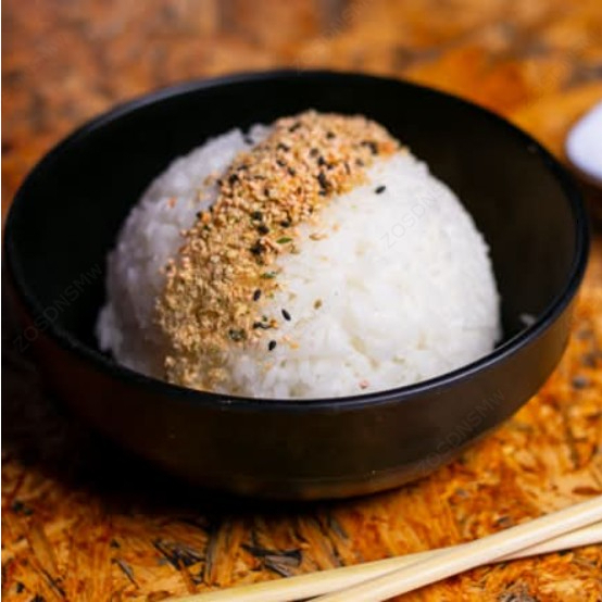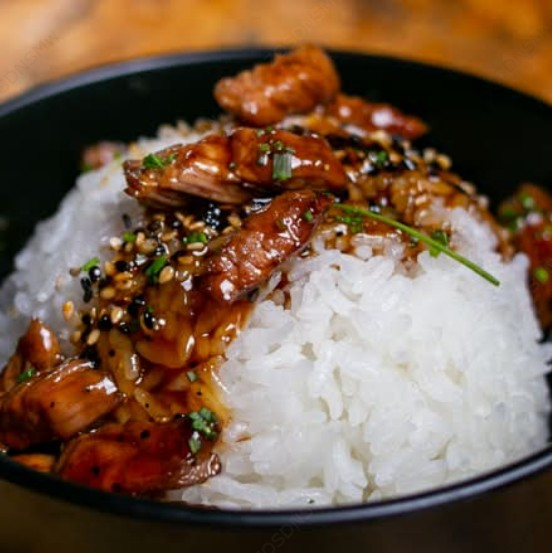 Arroz al vapor bañado en salsa dulce teriyaki.