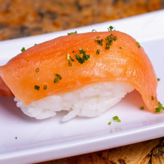 Fina lámina de salmón fresco servida sobre una base de arroz sazonado (1 pieza).