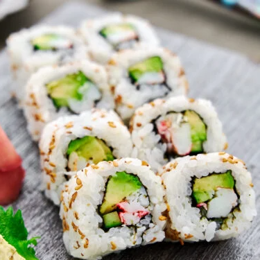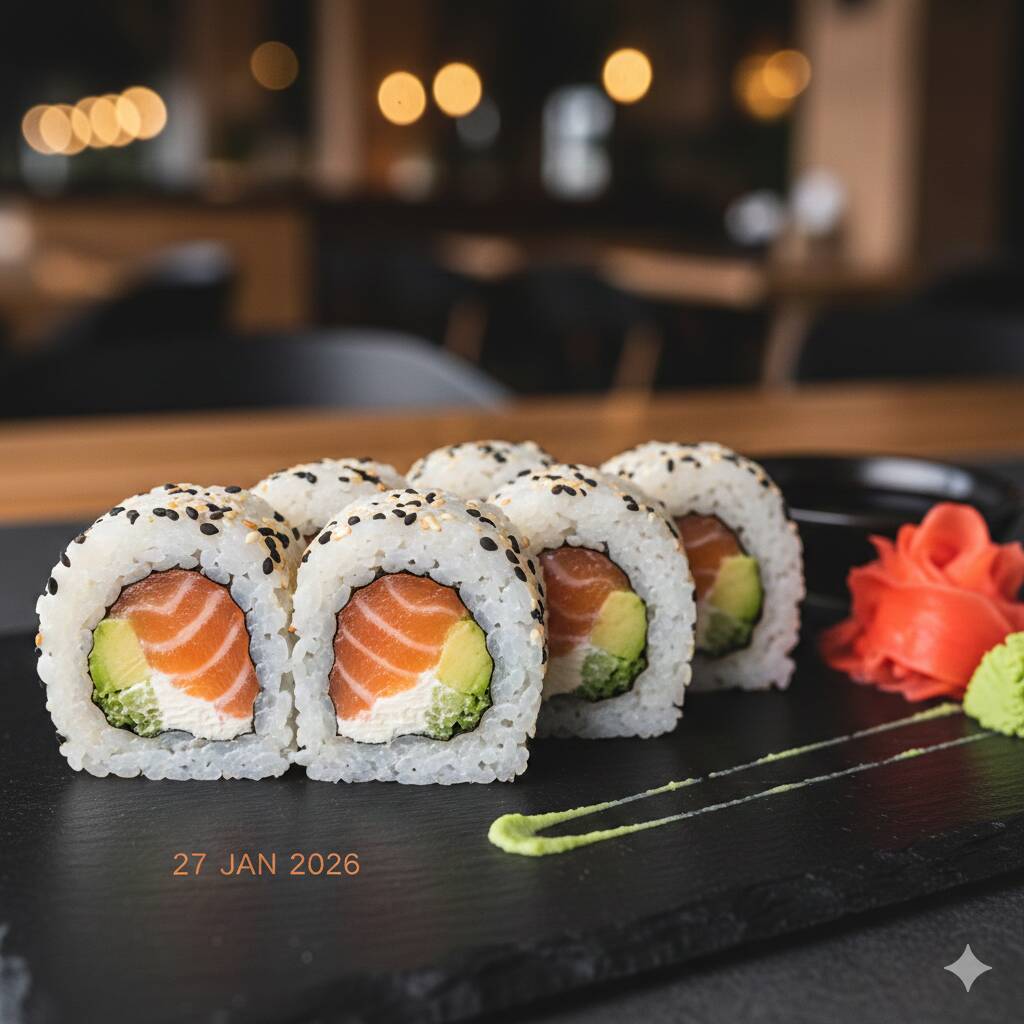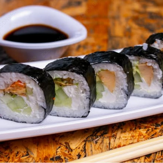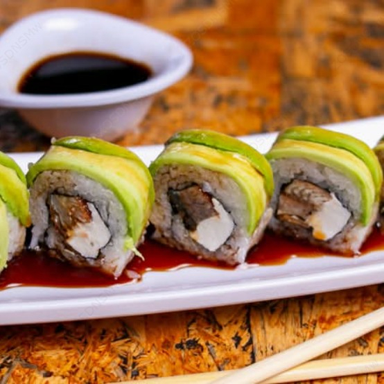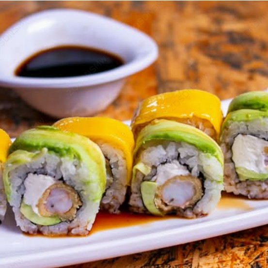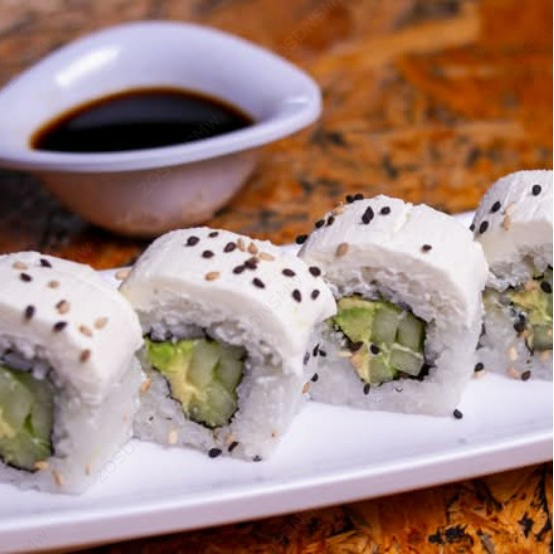 Delicioso rollo con pepino, aguacate y una capa generosa de queso crema.