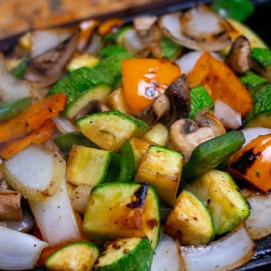 Selección de verduras a la plancha, sazonadas orientalmente, una deliciosa y sana elección.