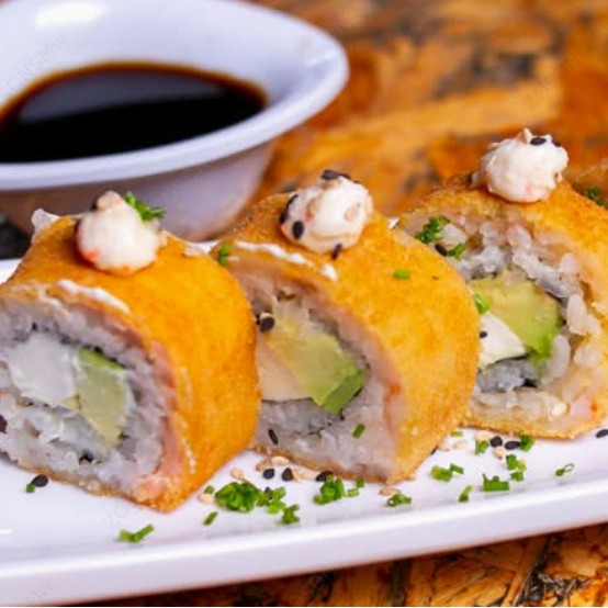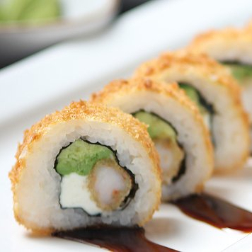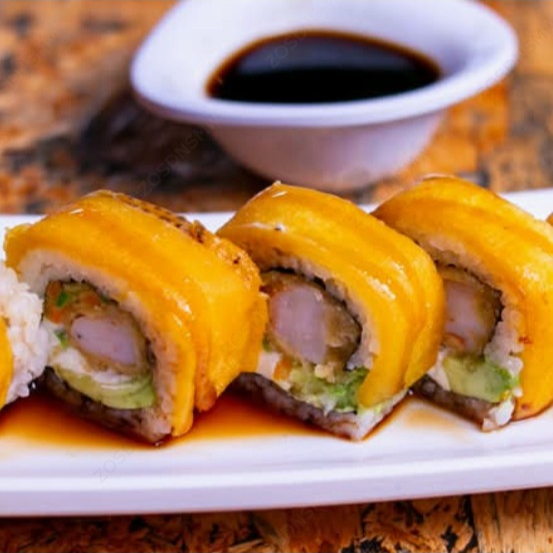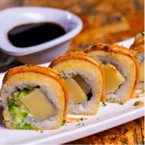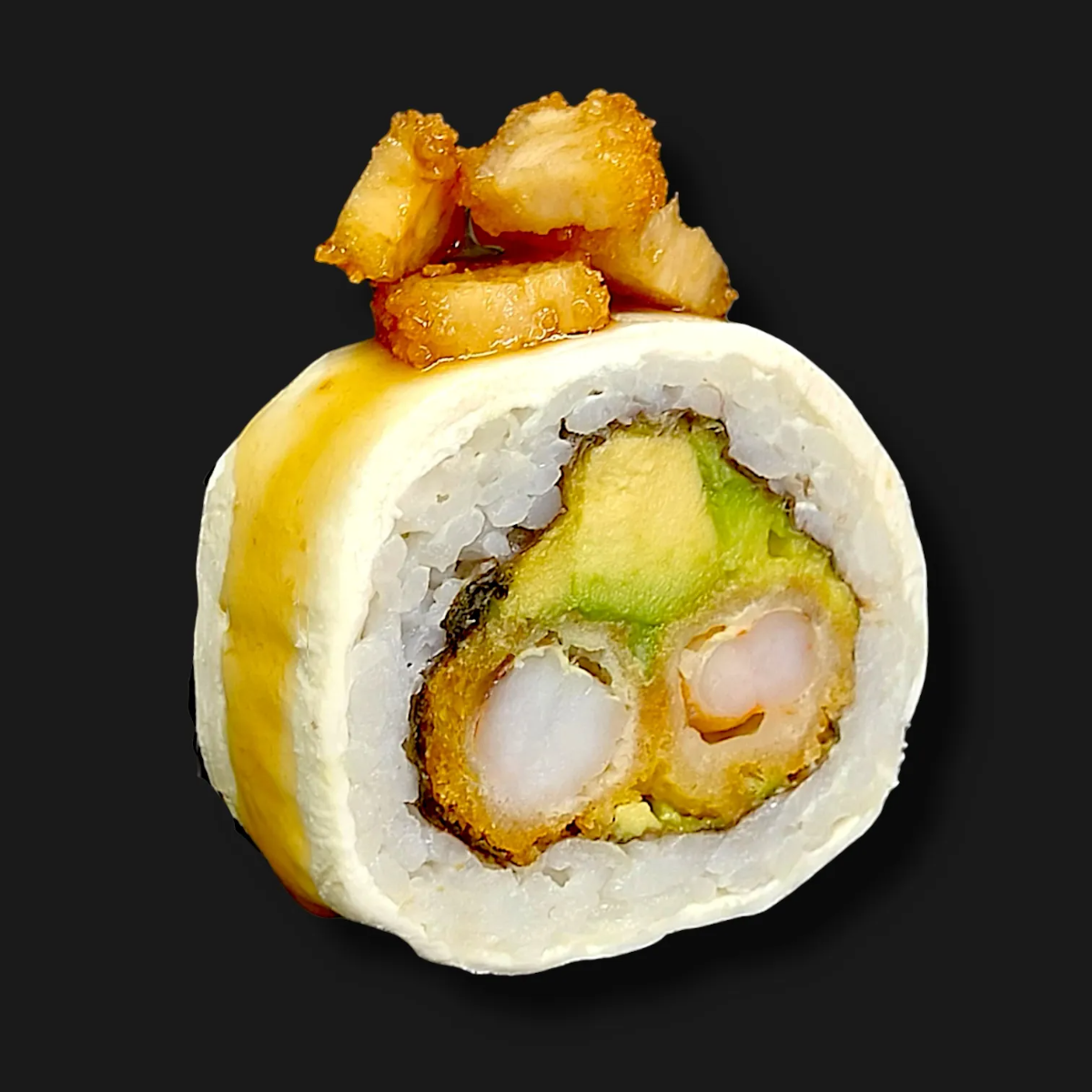 Camarón empanizado, queso, aguacate, mango y salsa de anguila.