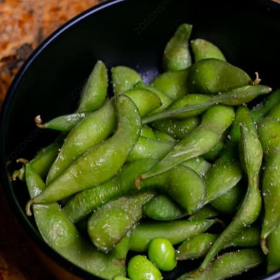 Vainas de soja tiernas preparadas al vapor con sal de grano o selladas a la plancha.