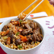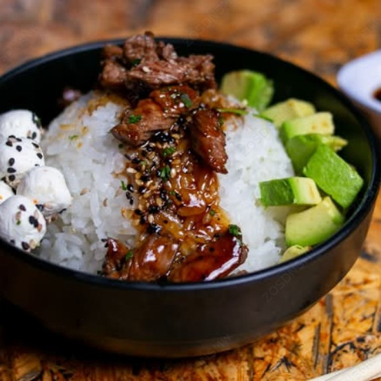 Arroz con filete, queso, aguacate y salsa agridulce.