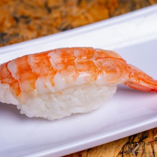 Camarón abierto en mariposa servido sobre arroz para sushi (1 pieza).