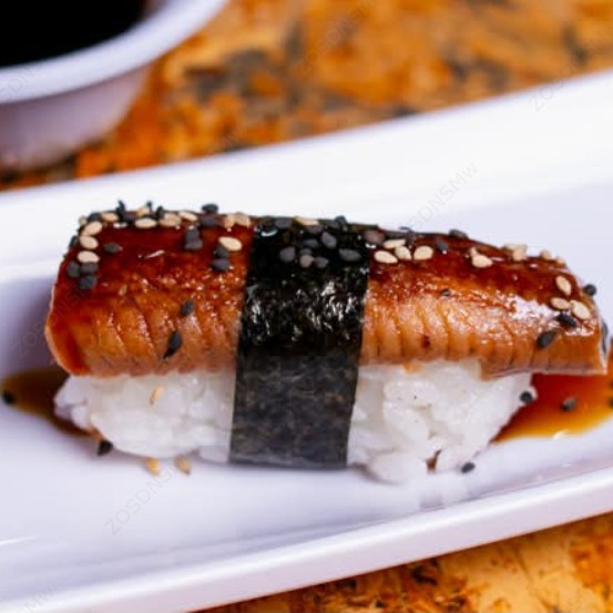 Corte de anguila de río marinada y asada sobre arroz de sushi (1 pieza).