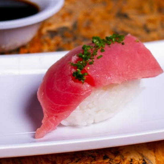 Corte de atún rojo fresco sobre una base de arroz prensado (1 pieza).