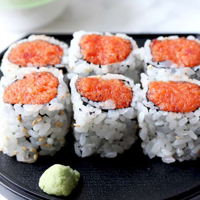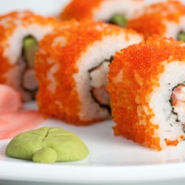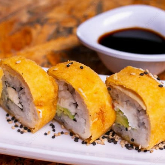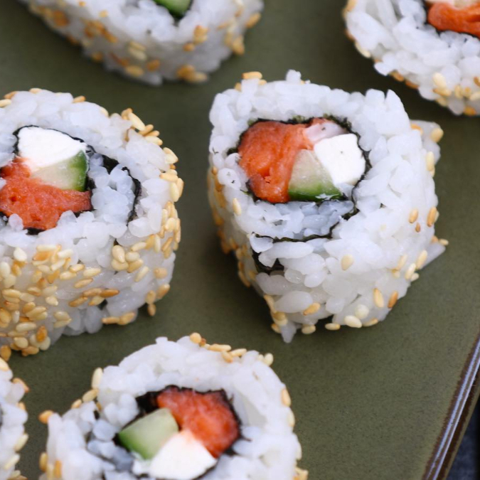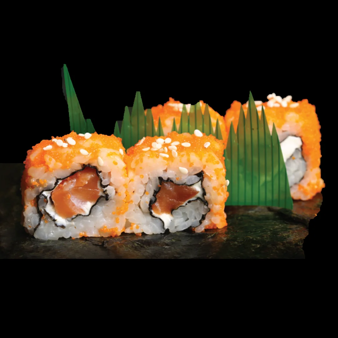 Con salmón, queso crema, aguacate, pepino, masago y ajonjolí.