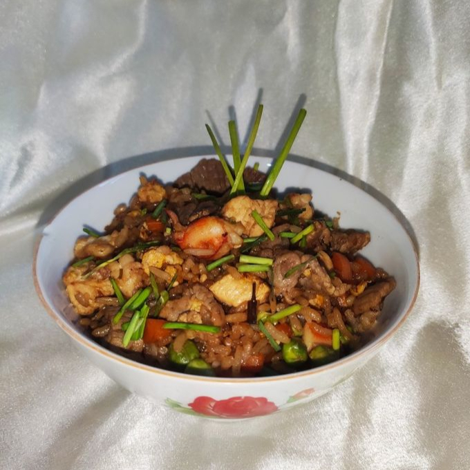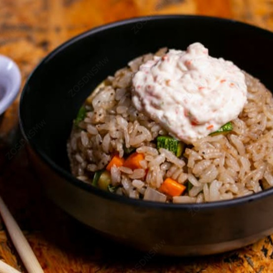 Arroz frito servido con la clásica pasta tampico de la casa.