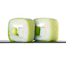 Rollo fresco envuelto en pepino con aguacate y alga por fuera.