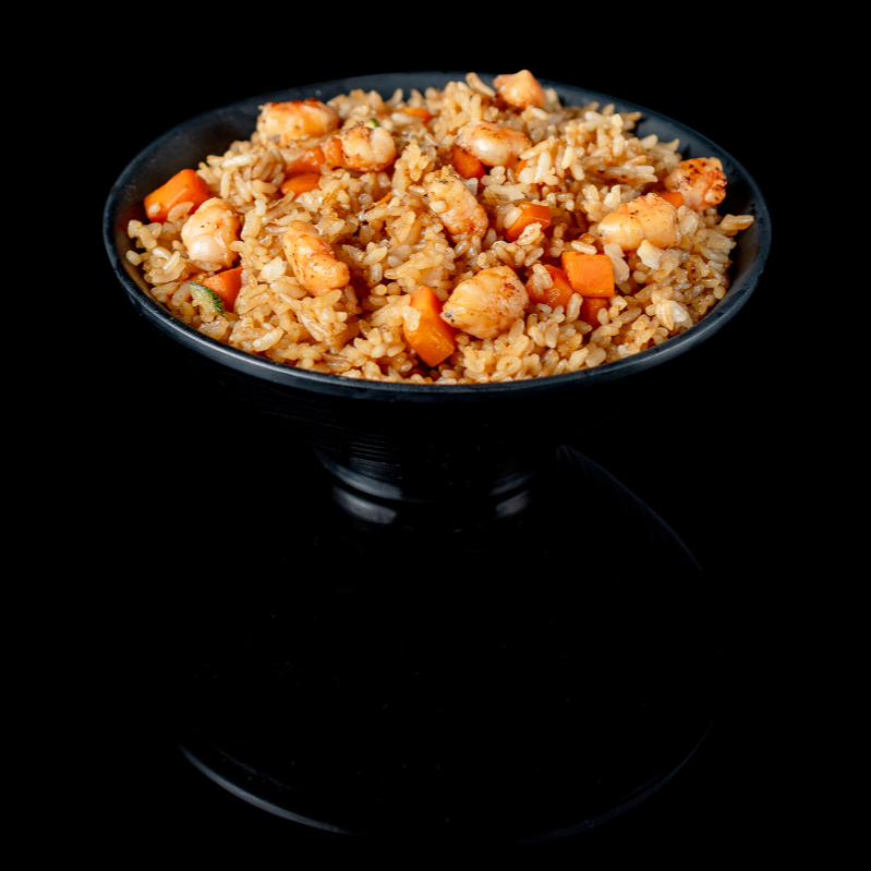 Arroz frito estilo japonés con camarones frescos y vegetales.