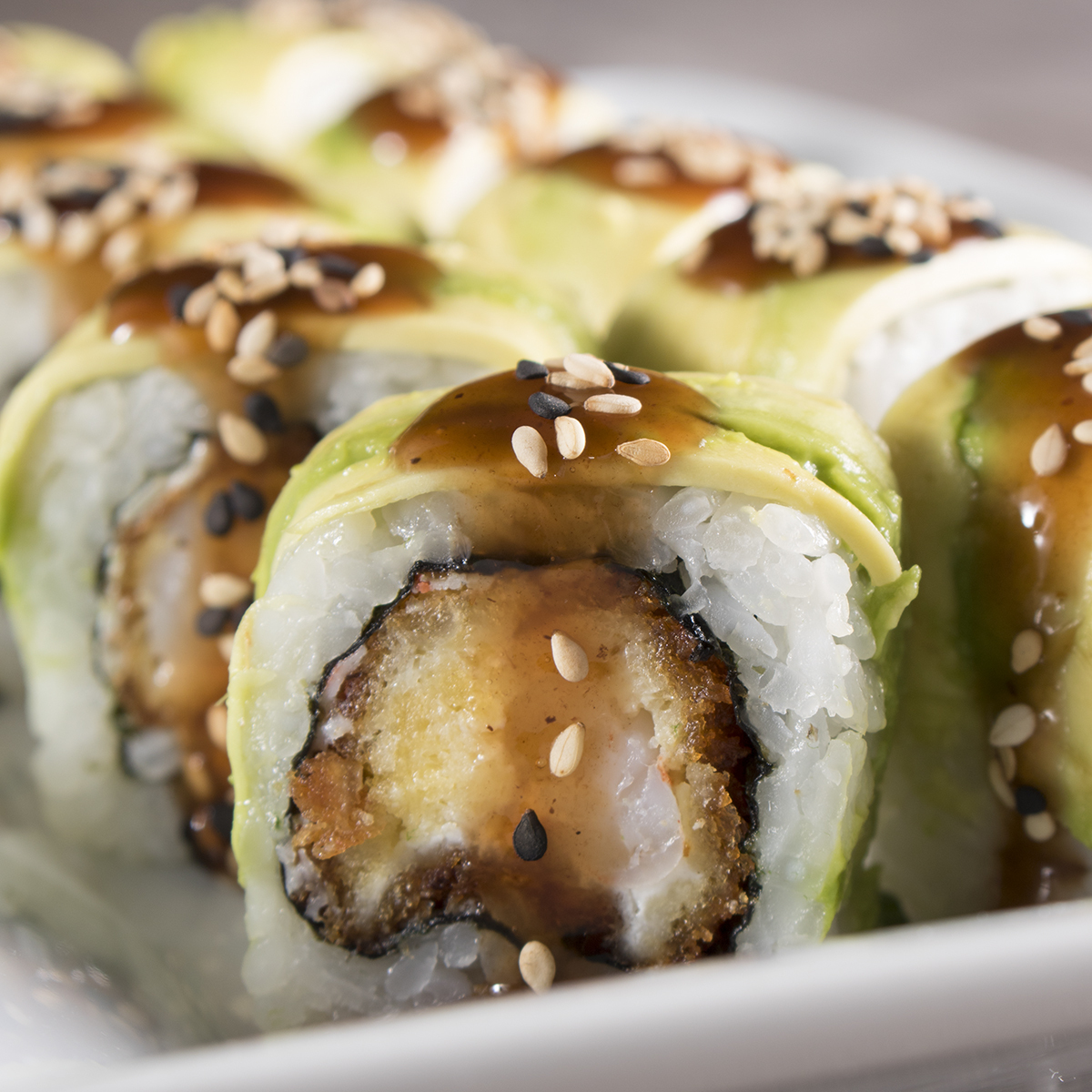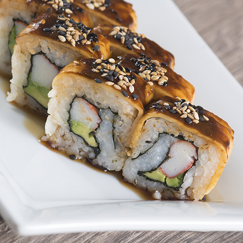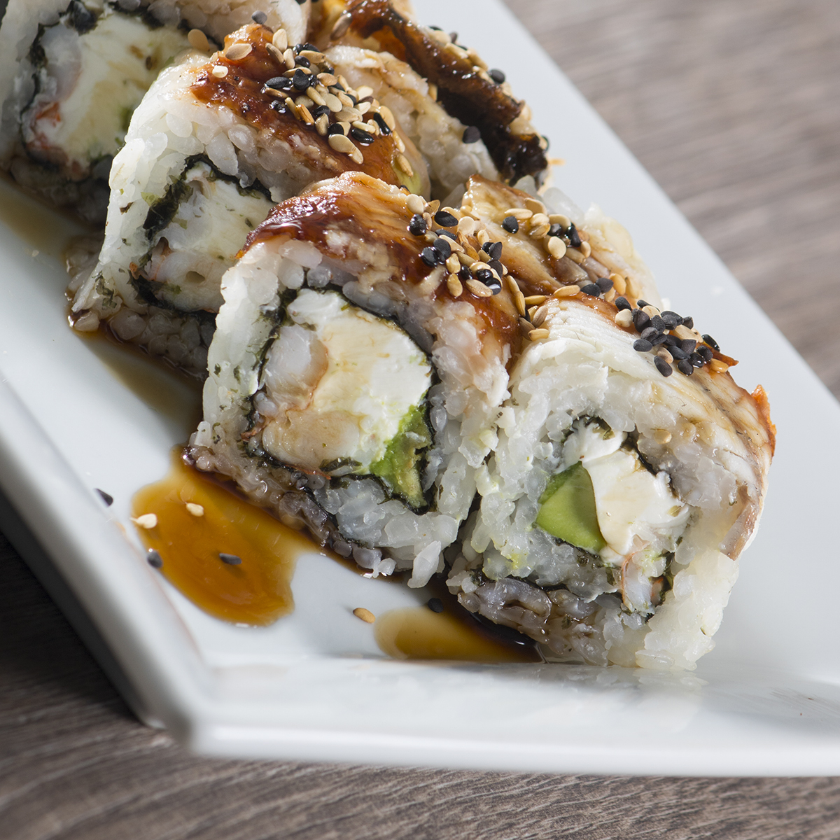Anguila ahumada, camarón, queso crema, aguacate, salsa dulce y ajonjolí